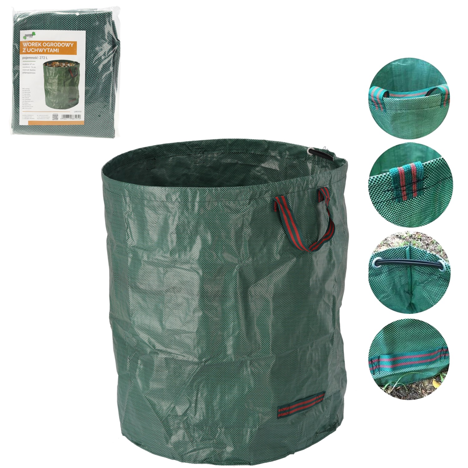 Найважливіші характеристики:Велика місткість – 272 л – вміщує велику кількість садових відходів, що дозволяє зменшити кількість поїздок до компостника або контейнера.Міцний матеріал – виготовлений з поліпропіленової тканини (PP) щільністю 150 г/м², стійкої до вологи, розривів та УФ-випромінювання.Ергономічні ручки – міцні ручки полегшують перенесення та спорожнення мішка.Складна конструкція – після закінчення роботи мішок можна легко скласти, що економить місце під час зберігання.Естетичний вигляд – темно-зелений колір ідеально поєднується з оточенням саду.