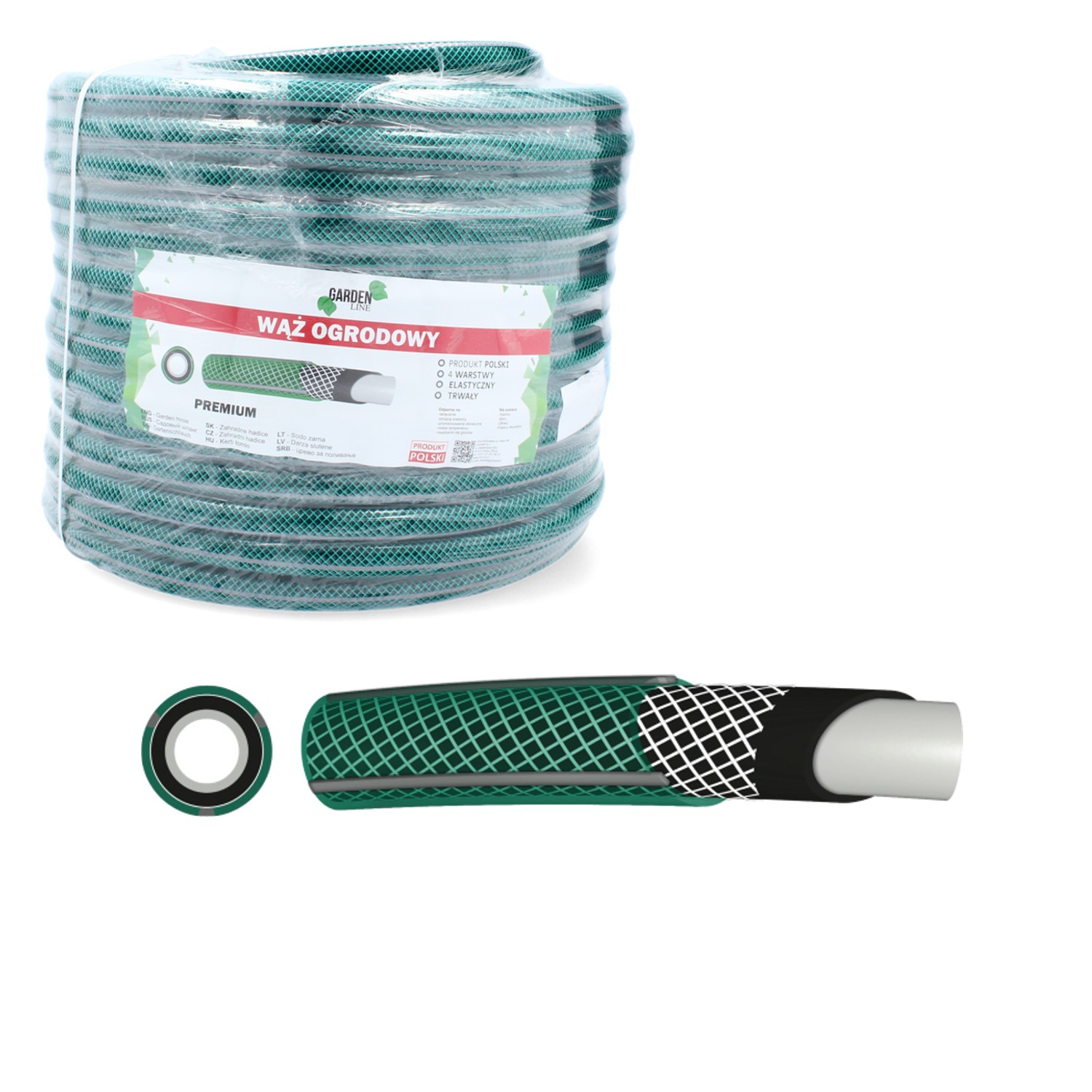 Садовий шланг PREMIUM довжиною 50 м і діаметром 1/2 — це продукт найвищої якості, виготовлений у Польщі. Його 4-шарова конструкція, виконана з еластичного ПВХ на основі суспензійного полівінілхлориду, терефталату та інших компонентів, забезпечує високу стійкість до пошкоджень і довговічність. Крім того, шланг посилений текстильною обмоткою, що збільшує його міцність. Шланг призначений для подачі води з робочим тиском 8 бар (при 20°C), а розривне тиск становить понад 24 бар (при 20°C). Шланг працює в широкому діапазоні температур, від -10°C до +60°C, що робить його стійким до мінливих погодних умов і дозволяє використовувати його протягом усього року.