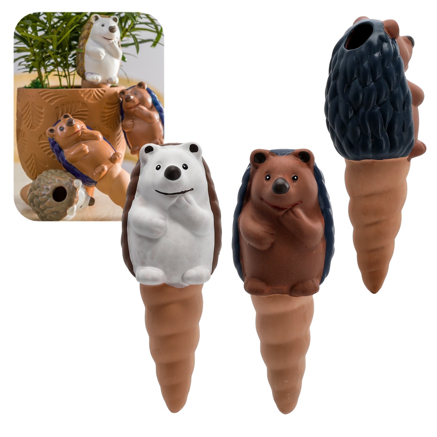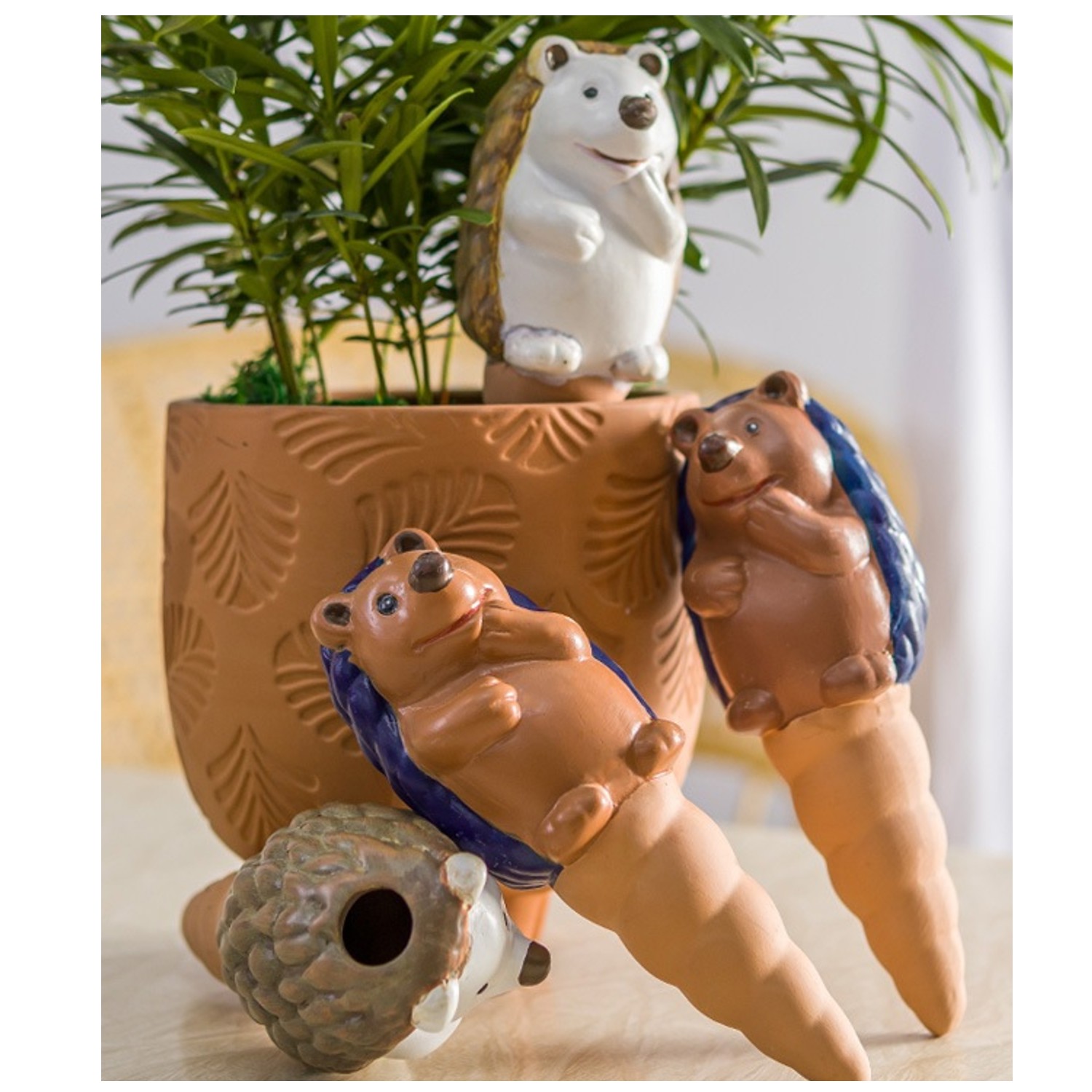 Керамічний дозатор для квітів і кімнатних рослин забезпечує постійне і належне зволоження ґрунту під час тривалої відсутності вдома або для людей, які часто забувають поливати свої рослини. Ідеально підходить для кімнатних рослин, домашніх рослин, рослин на терасі, висячих рослин і зовнішніх садів. Самополивальні шипики гарантують, що ваші рослини завжди будуть свіжими, красивими та добре зволоженими. Дозатор має форму їжачка, що додасть чарівності вашим кімнатним рослинам та внесе трохи веселощів у сад або інтер'єр.