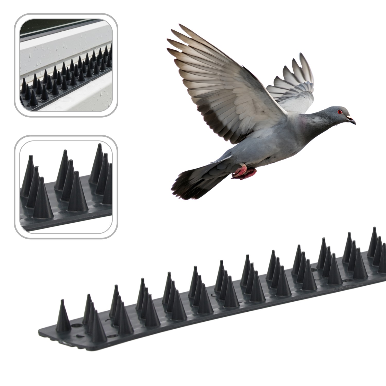 Пластикові шипи – це ефективний захист від сидіння та забруднення поверхні птахами. Ідеально підходять для монтажу на підвіконнях, дахах, балюстрадах або карнизах. Легка та непомітна конструкція не травмує тварин, одночасно ефективно відлякуючи їх від приземлення.