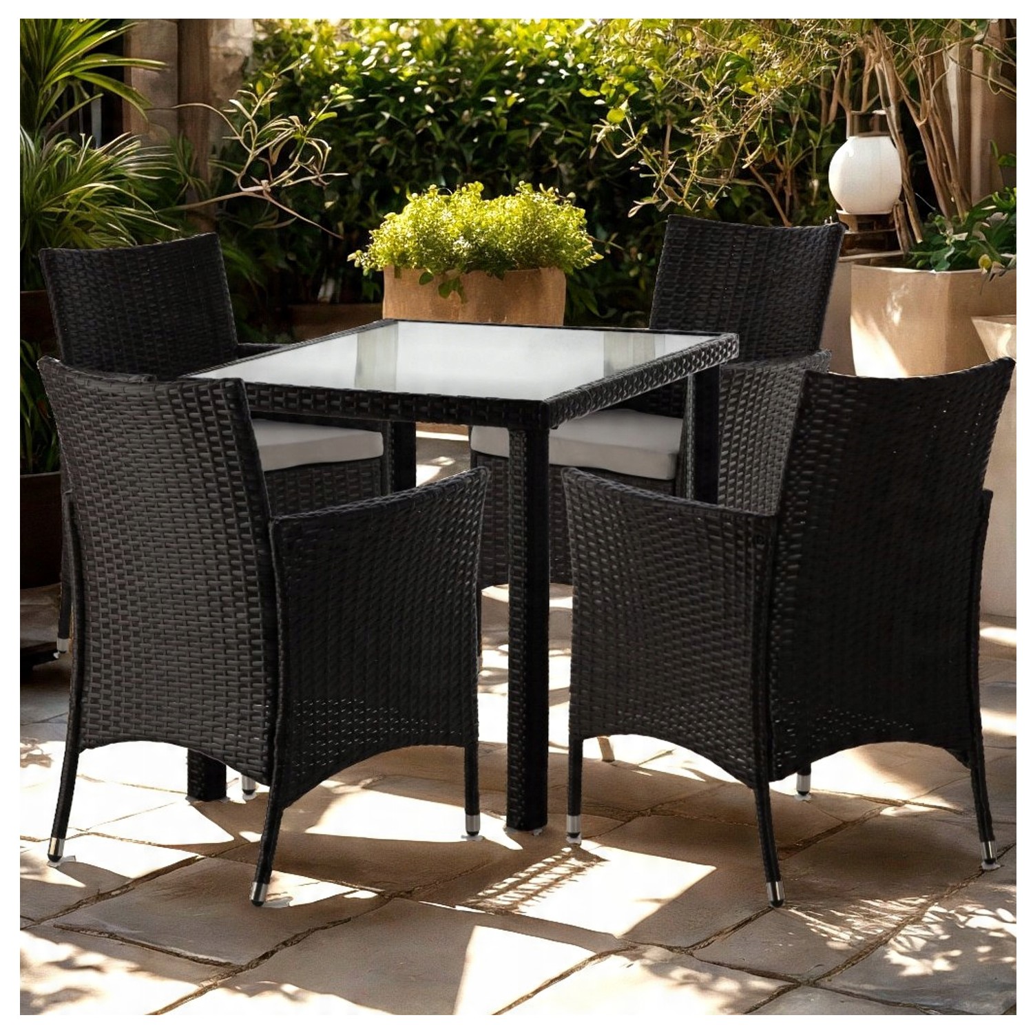 Комплект меблів з ротанга – журнальний столик + 4 стільці – має універсальне застосування і є справжньою окрасою саду, тераси, зимового саду або вітальні. Зручні стільці та елегантний стіл заохочують проводити час у колі сім'ї або друзів. Роттангенний комплект вражає не тільки елегантним зовнішнім виглядом, але й тривалим терміном експлуатації. Дуже зручні бежеві подушки з поліестеру ідеально поєднуються за кольором з меблями. Комплект підходить для саду, балкона, тераси, вітальні або оранжереї.