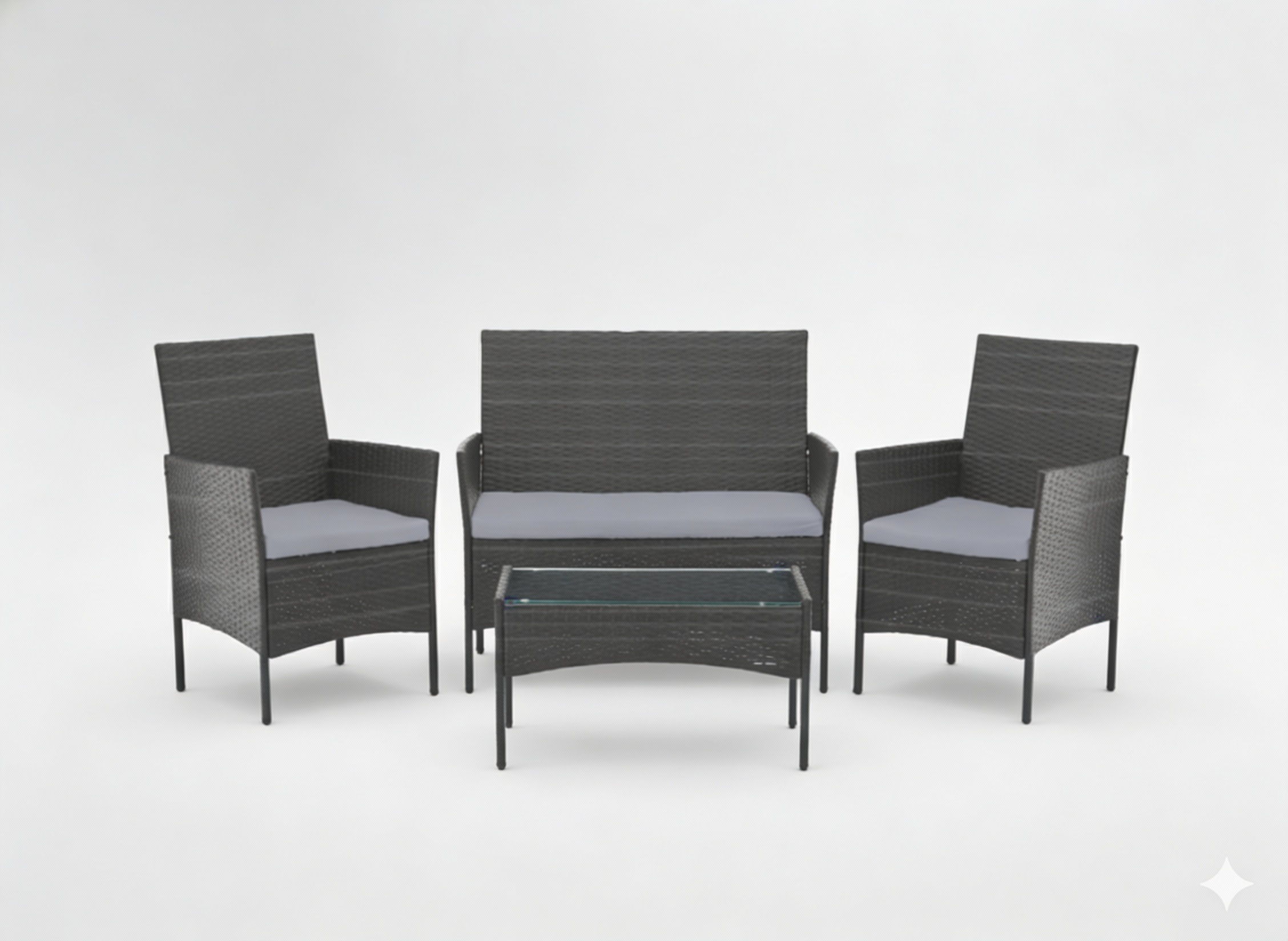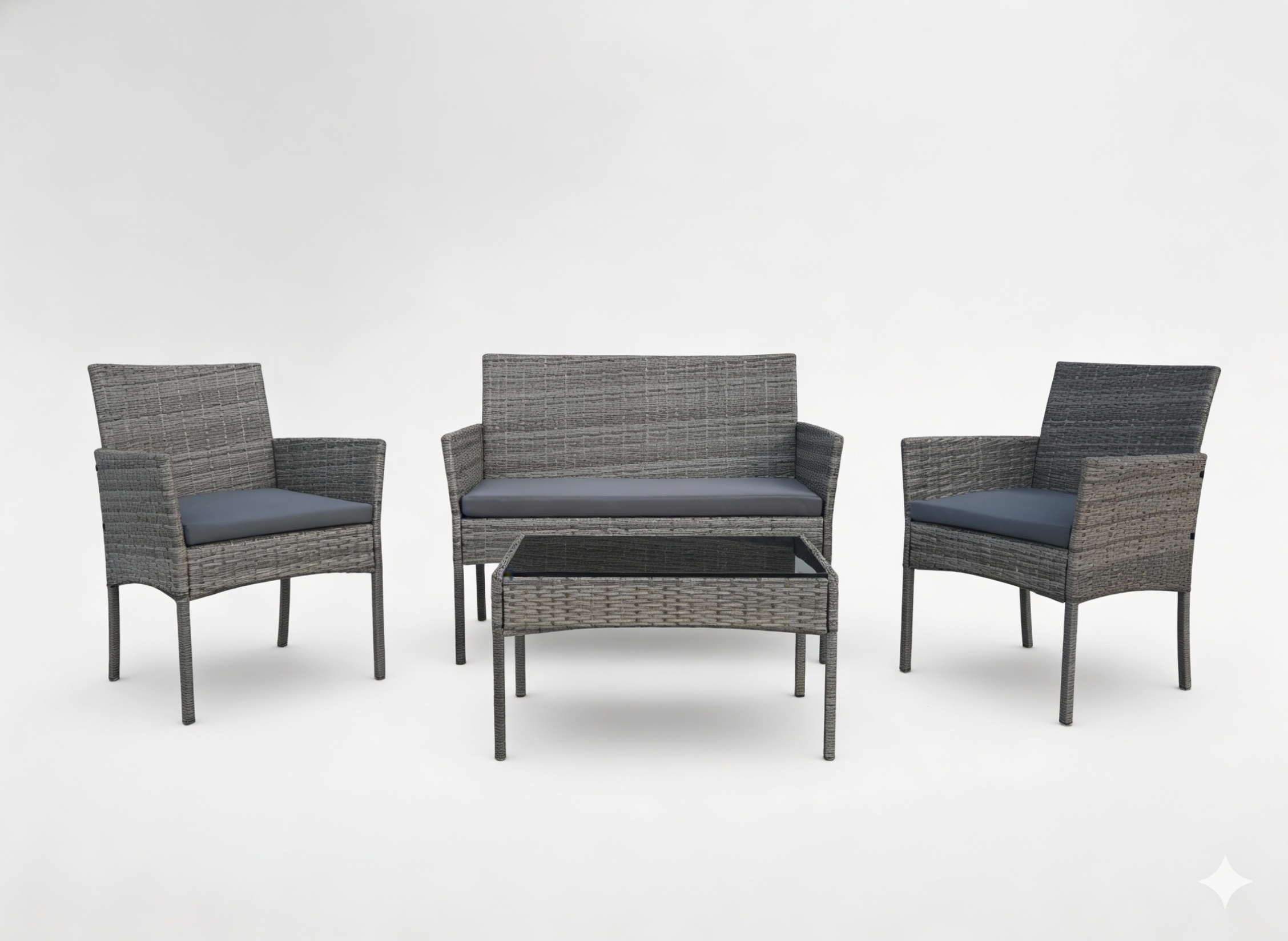 Елегантний комплект садових меблів поєднує в собі зручність, функціональність та позачасовий дизайн. Виготовлений з міцних матеріалів, таких як техноротанг та сталь, він характеризується високою стійкістю до атмосферних умов та УФ-випромінювання. Водонепроникні подушки забезпечують комфорт використання, а легкий догляд робить комплект ідеальним вибором для саду, тераси або балкона, гарантуючи стиль і зручність на довгі роки.