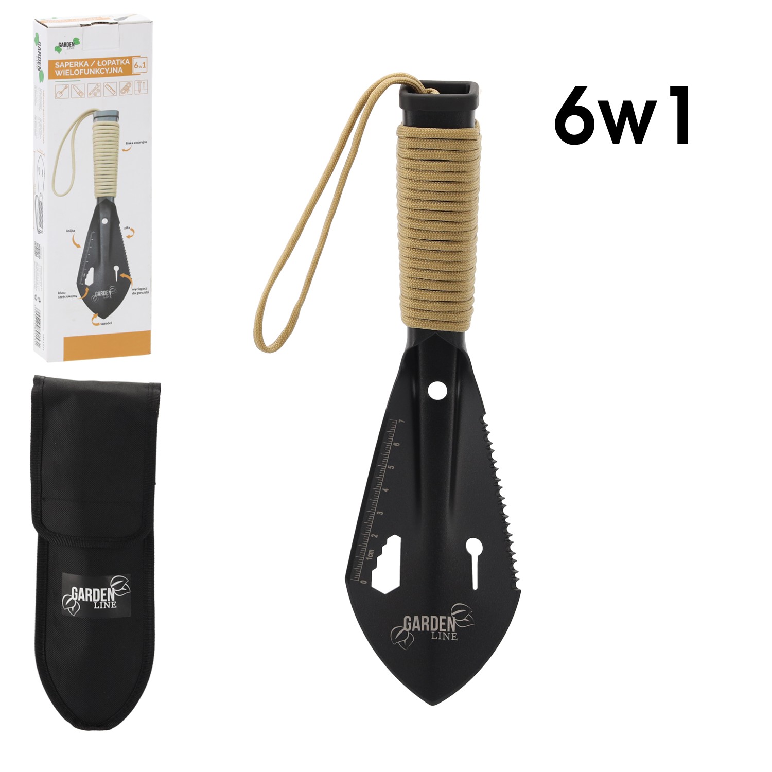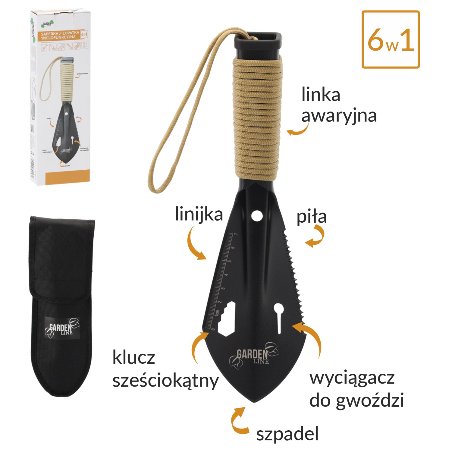 Garden Line SAP1531 — це багатофункціональна лопатка 6 в 1, яка стане в нагоді як у саду, так і під час кемпінгу, а також в екстрених ситуаціях під час подорожі. Завдяки продуманій конструкції та міцним матеріалам цей зручний інструмент стане незамінним елементом вашого спорядження.