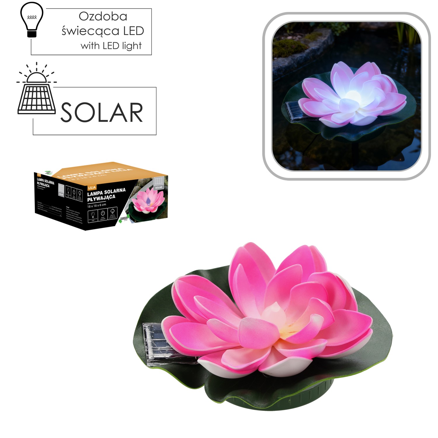 Сонячна плаваюча лілія може бути встановлена в будь-якому місці з відповідним сонячним освітленням, що робить її надзвичайно універсальною і практичною садовою прикрасою. Вбудований RGB LED-діод випромінює різнокольорове світло, створюючи атмосферу в вашому саду.
