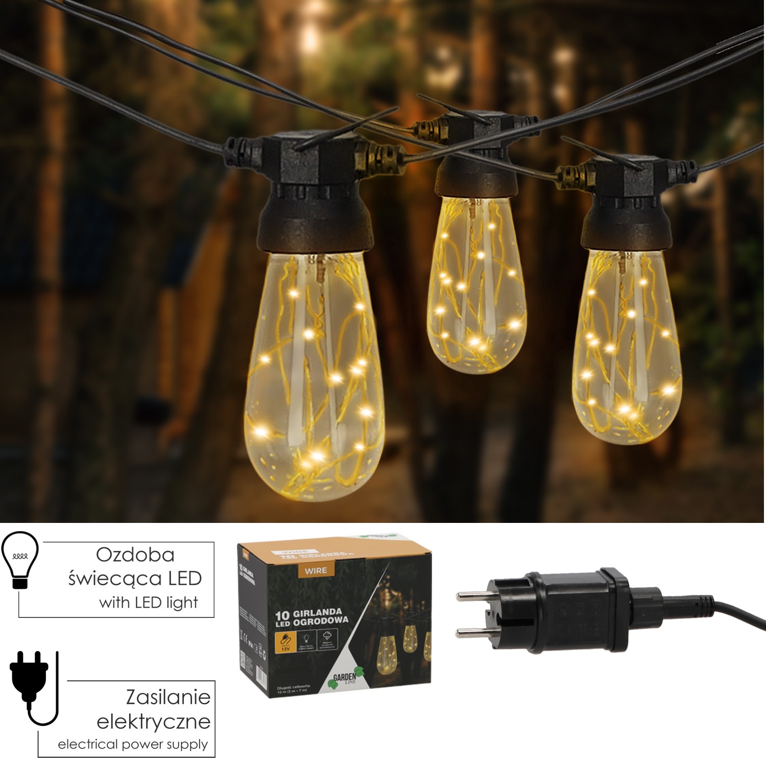 Садова гірлянда довжиною 10 метрів, яка ідеально підходить для прикраси балкона, тераси або саду. Оснащена 10 енергоефективними світлодіодними лампочками теплого білого кольору (3000K), забезпечує приємне і атмосферне освітлення в літні вечори. Завдяки кріпленням для підвішування монтаж є швидким і простим.