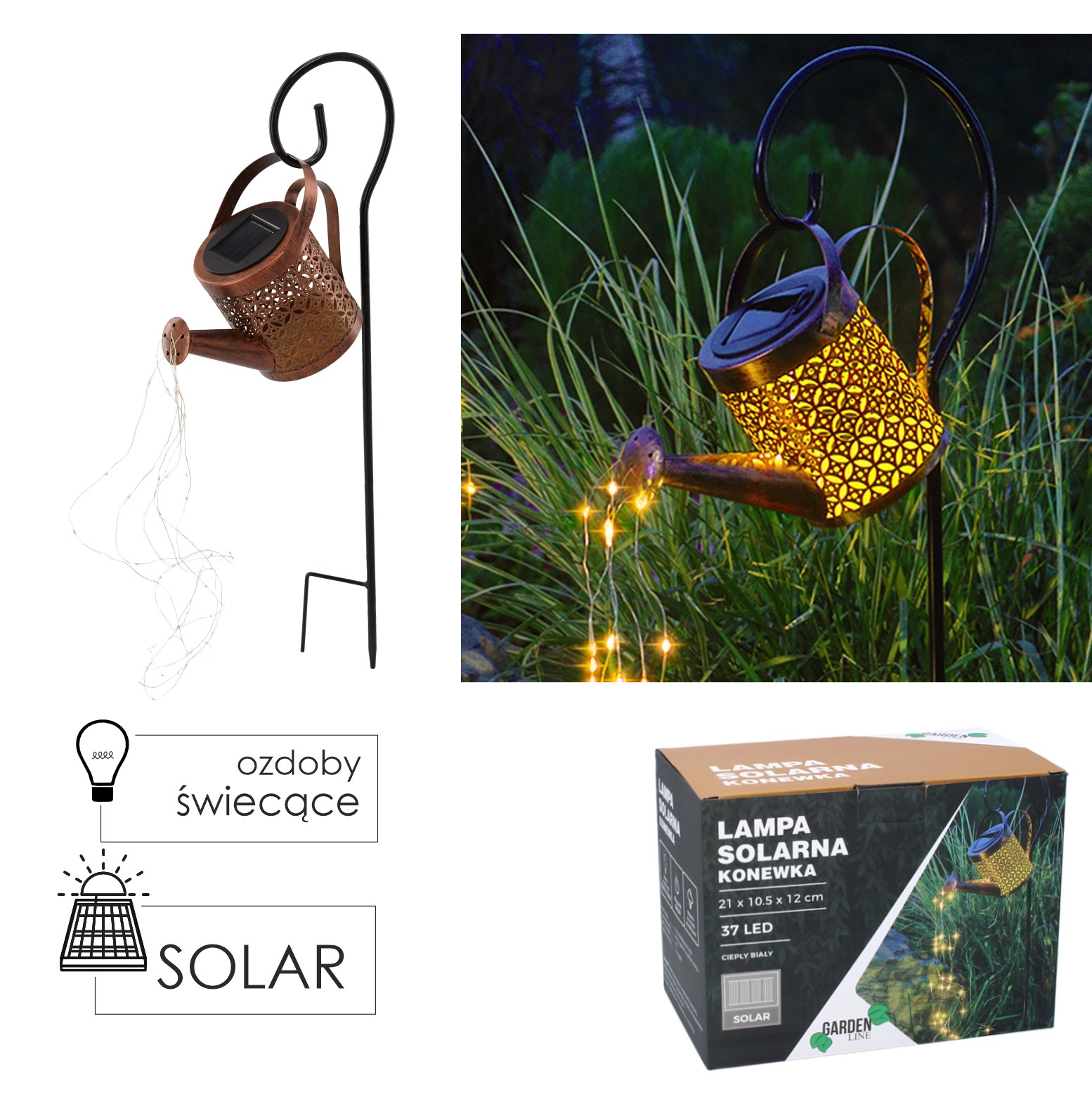 Сонячна лампа LED. Ідеально підходить для саду. Її можна встановити в будь-якому місці, де є відповідне сонячне освітлення. Сонячні лампи найкраще виглядають, встановлені вздовж доріжок, алейок, під'їздів, на терасах або верандах. Вони підкреслюють і доповнюють садову архітектуру, зокрема водоймища або рослинні композиції. Лампи живляться сонячною енергією, тому не вимагають додаткових фінансових витрат.Сонячна лійка зі світлом, розміри лійки: 21x10,5x12см, 6 шнурів, кожен шнур з 6 світлодіодами, всього 37 світлодіодів; Всередині знаходиться 1 акумулятор NI-MH,IP44, час заряджання: 7-8 годин, час роботи: 6-7 годин. загальна висота з гачком: приблизно 80 см. Тепла біла світлодіодна лампа