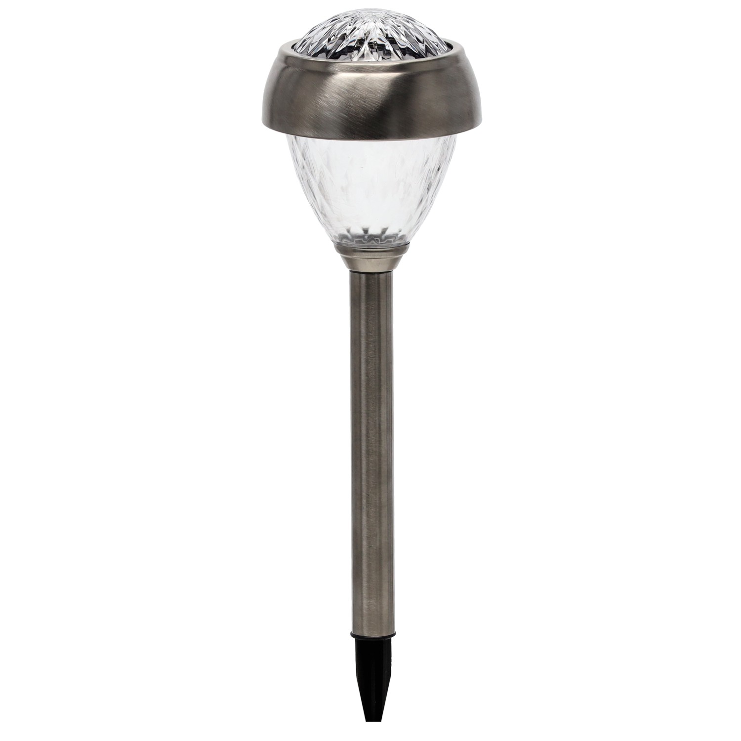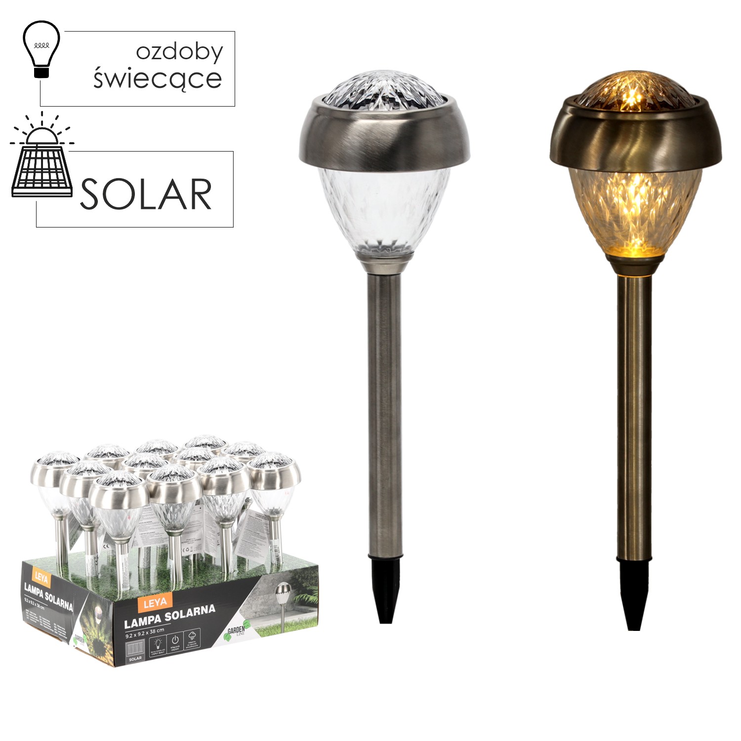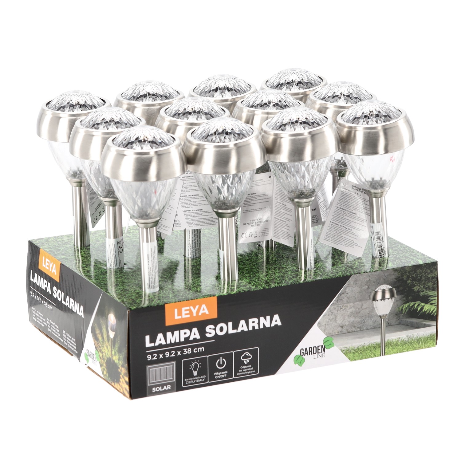 Сонячна лампа LED. Ідеально підходить для саду. Її можна встановити в будь-якому місці, де є відповідне сонячне освітлення. Сонячні лампи найкраще виглядають, встановлені вздовж доріжок, алейок, під'їздів, на терасах або верандах. Вони підкреслюють і доповнюють садову архітектуру, зокрема водоймища або рослинні композиції. Лампи живляться сонячною енергією, тому не вимагають додаткових фінансових витрат.• Лінія продукту: Garden Line• Розміри продукту: 92 x 92 x 380 мм• Сонячна батарея: аморфний кремній• Ємність батареї: 100 мАг Ni MH з можливістю заряджання• Середня напруга: 1 x 1,2 В• Батарея AAA• Тип лампочки: 2 x біла LED• Матеріал виробу: пластик, нержавіюча сталь• Колір продукту: СРІБНИЙ• Ступінь захисту продукту: IP44• Стійка до атмосферних умов.• Кріпиться до землі за допомогою спеціального пластикового штифта • Основний колір продукту: срібний• Стійкий до атмосферних умов.• Кріпиться до землі за допомогою спеціального пластикового штифта • Упаковка: 12 штук в коробці