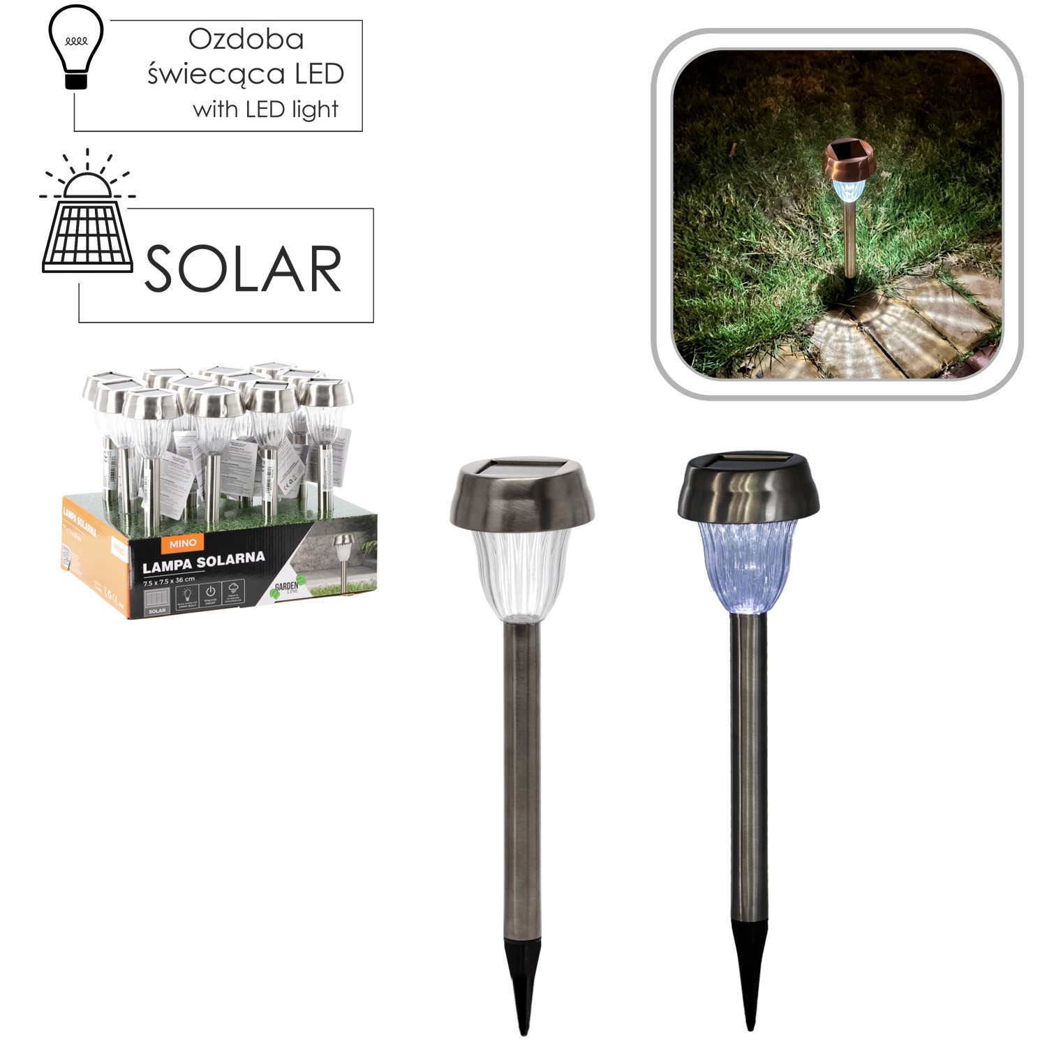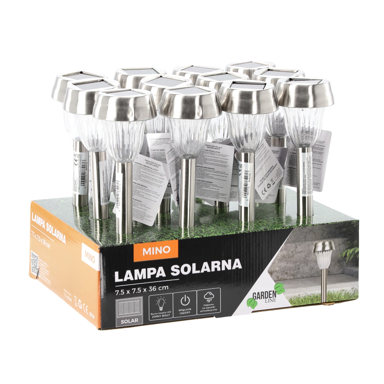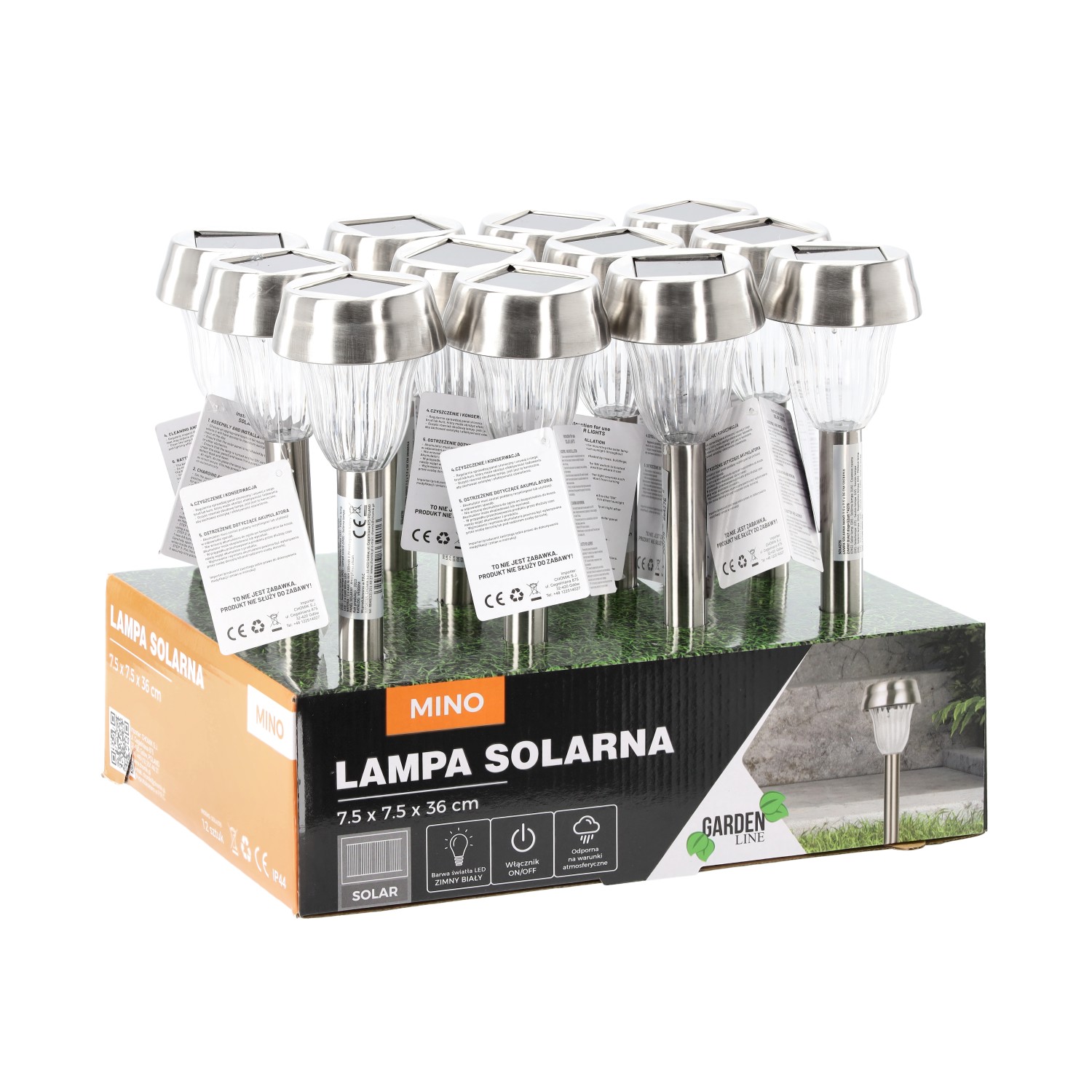 Сонячна лампа LED. Ідеально підходить для саду. Її можна встановити в будь-якому місці, де є відповідне сонячне освітлення. Сонячні лампи найкраще виглядають, встановлені вздовж доріжок, алейок, під'їздів, на терасах або верандах. Вони підкреслюють і доповнюють садову архітектуру, зокрема водоймища або рослинні композиції. Лампи живляться сонячною енергією, тому не вимагають додаткових фінансових витрат.• Лінія продукту: Garden Line• Розміри продукту: 75 x 75 x 360 мм• Сонячна батарея: аморфний кремній 39 x 39 мм• Ємність батареї: 100 мАг Ni MH з можливістю заряджання• Середня напруга: 1 x 1,2 В• Батарея AAA• Тип лампочки: 1 x білий холодний світлодіод• Основний матеріал виробу: пластик, нержавіюча сталь • Основний колір продукту: срібний • Ступінь захисту продукту: IP44• Стійка до атмосферних умов.• Кріпиться до землі за допомогою спеціального пластикового штифта • Стійка до атмосферних умов.• Кріпиться до землі за допомогою спеціального пластикового штифта • дисплей: 12 штук срібного корпусу з прозорою лінзою