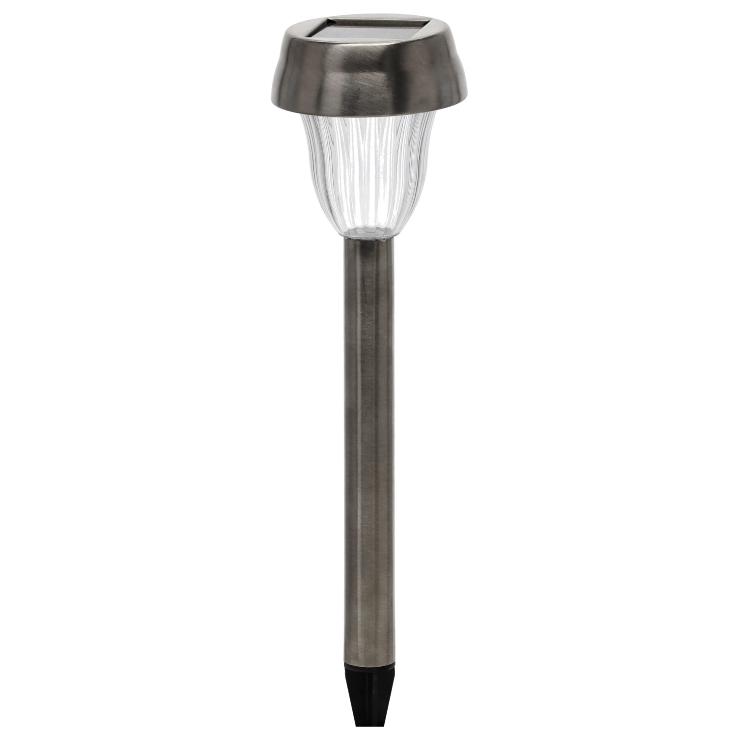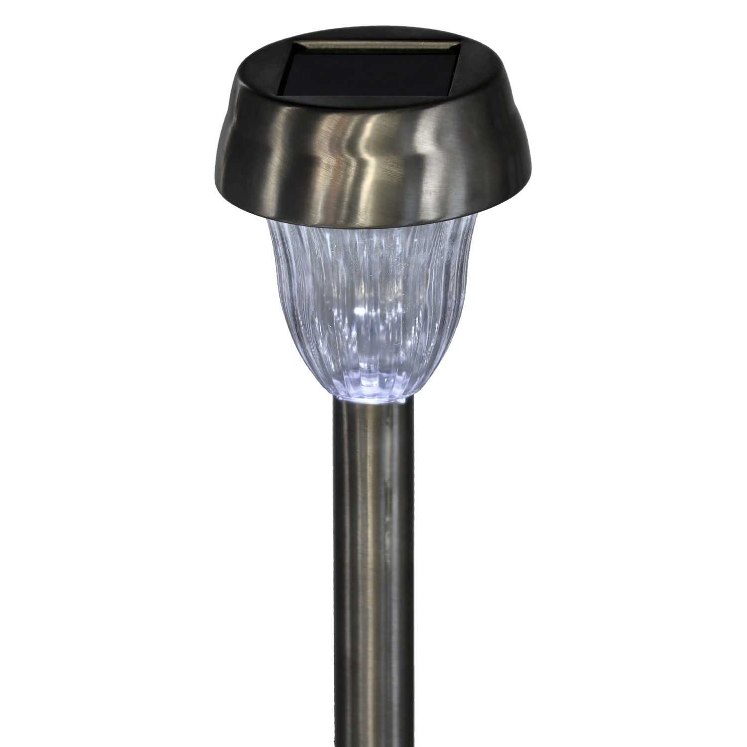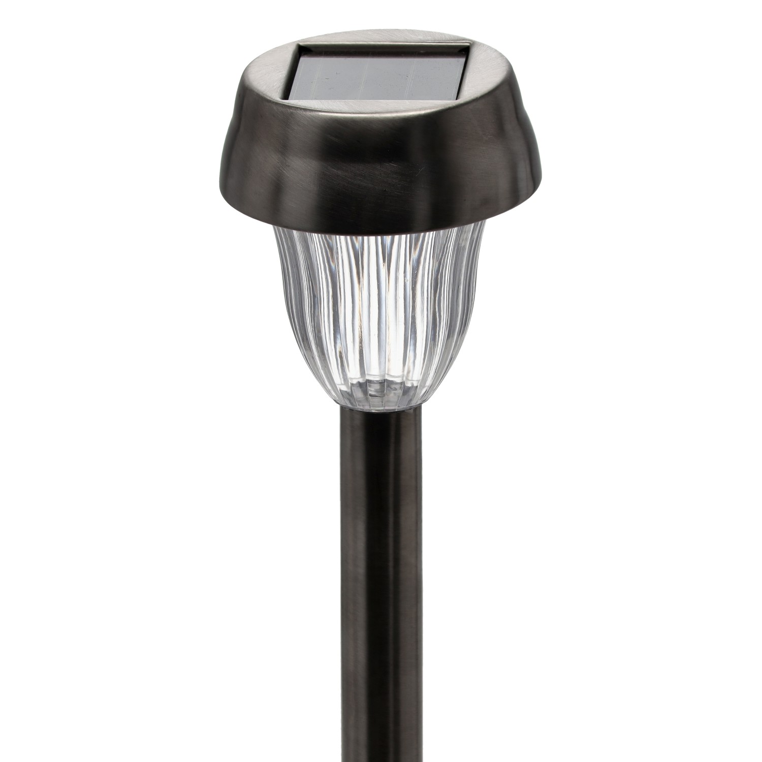 Сонячна лампа LED. Ідеально підходить для саду. Її можна встановити в будь-якому місці, де є відповідне сонячне освітлення. Сонячні лампи найкраще виглядають, встановлені вздовж доріжок, алейок, під'їздів, на терасах або верандах. Вони підкреслюють і доповнюють садову архітектуру, зокрема водоймища або рослинні композиції. Лампи живляться сонячною енергією, тому не вимагають додаткових фінансових витрат.• Лінія продукту: Garden Line• Розміри продукту: 75 x 75 x 360 мм• Сонячна батарея: аморфний кремній 39 x 39 мм• Ємність батареї: 100 мАг Ni MH з можливістю заряджання• Середня напруга: 1 x 1,2 В• Батарея AAA• Тип лампочки: 1 x білий холодний світлодіод• Основний матеріал виробу: пластик, нержавіюча сталь • Основний колір продукту: срібний • Ступінь захисту продукту: IP44• Стійка до атмосферних умов.• Кріпиться до землі за допомогою спеціального пластикового штифта • Стійка до атмосферних умов.• Кріпиться до землі за допомогою спеціального пластикового штифта • дисплей: 12 штук срібного корпусу з прозорою лінзою