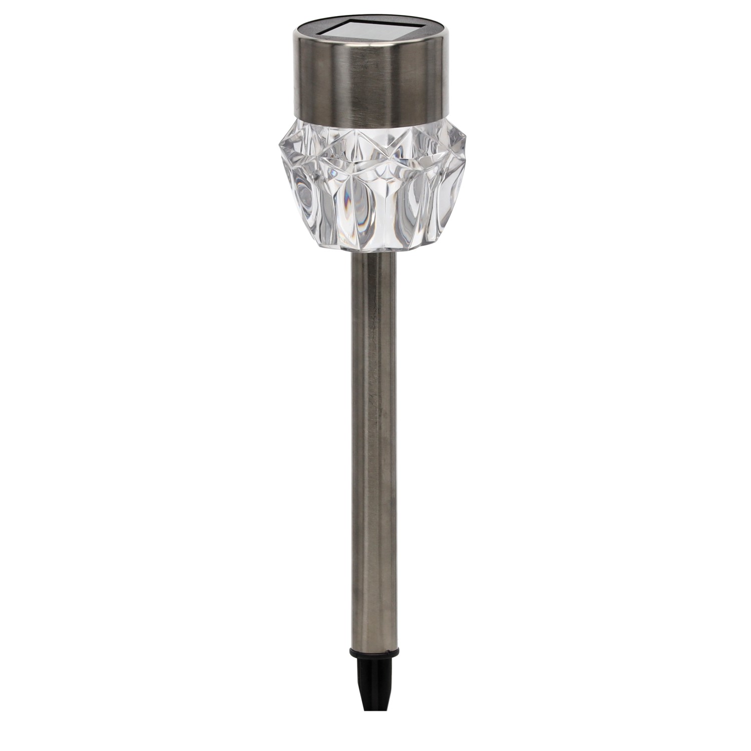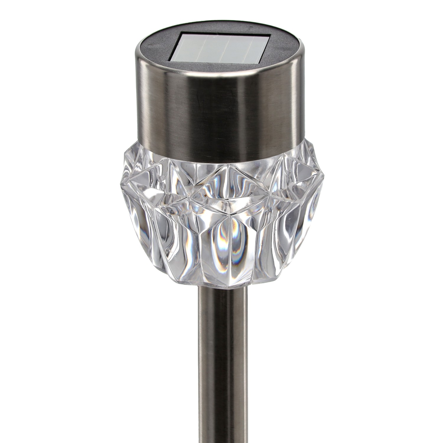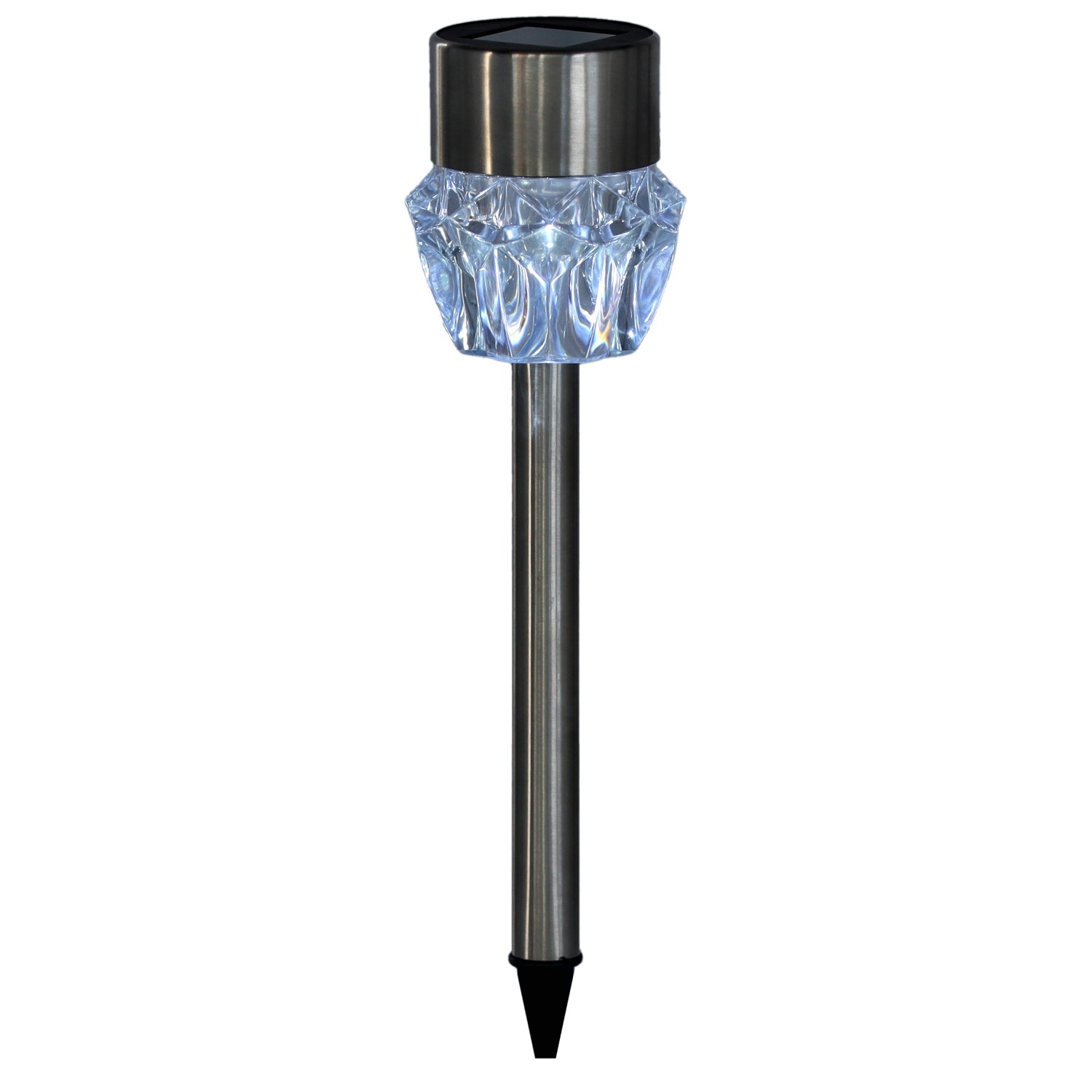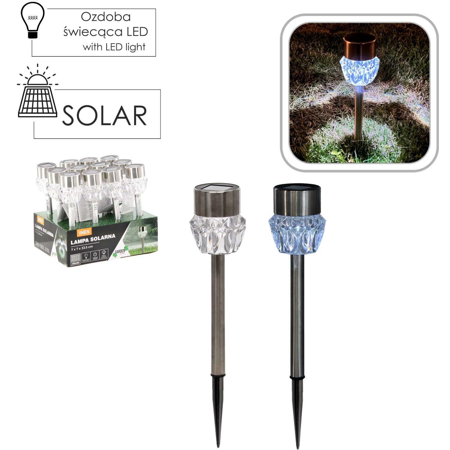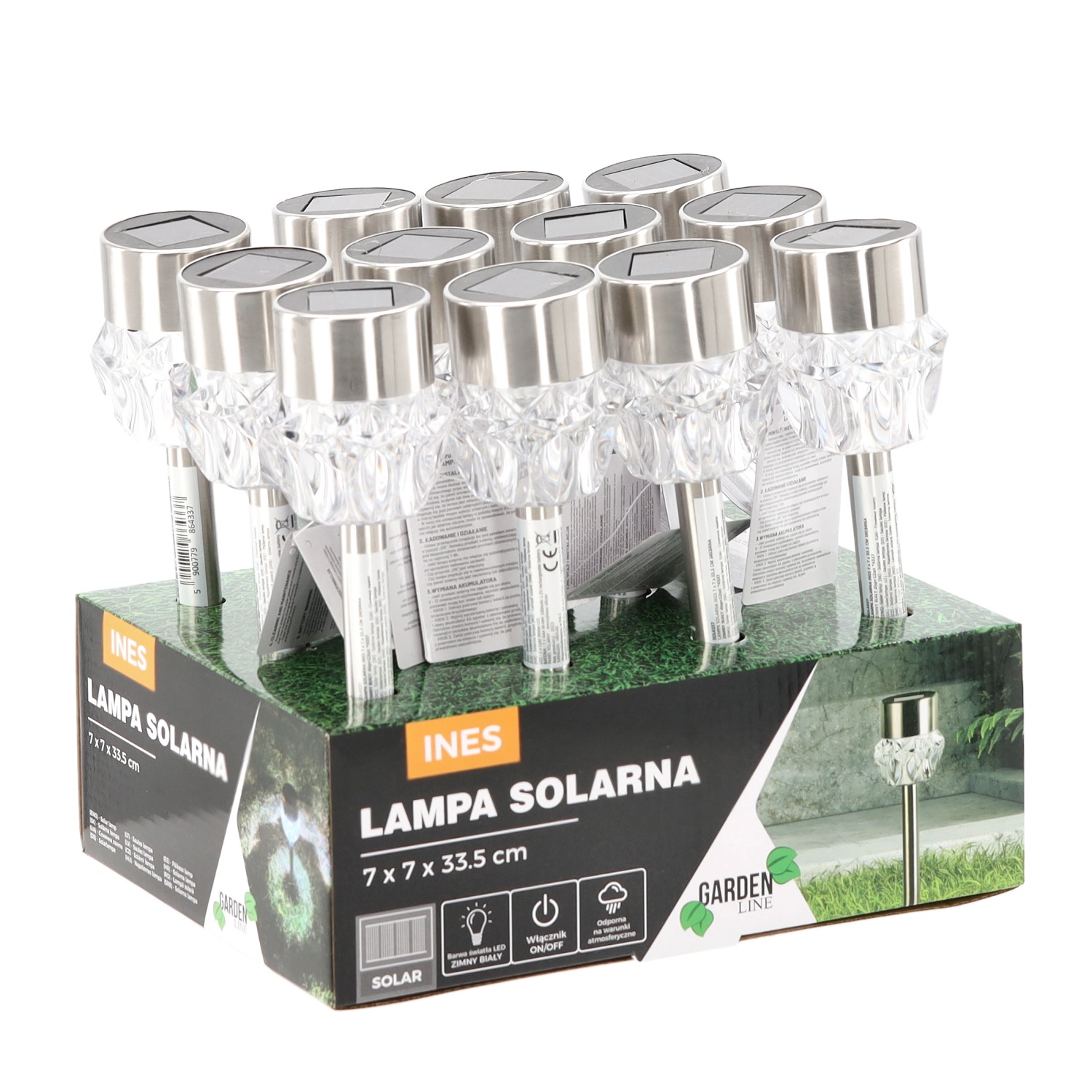 Сонячна лампа LED. Ідеально підходить для саду. Її можна встановити в будь-якому місці, де є відповідне сонячне освітлення. Сонячні лампи найкраще виглядають, встановлені вздовж доріжок, алейок, під'їздів, на терасах або верандах. Вони підкреслюють і доповнюють садову архітектуру, зокрема водоймища або рослинні композиції. Лампи живляться сонячною енергією, тому не вимагають додаткових фінансових витрат.• Лінія продукту: Garden Line• Розміри продукту: 70 x 70 x 335 мм• Сонячна батарея: аморфний кремній 30 x 30 мм• Ємність батареї: 100 мАг Ni MH з можливістю заряджання• Середня напруга: 1 x 1,2 В• Батарея AAA• Тип лампочки: 1 x білий холодний світлодіод• Основний матеріал виробу: пластик, нержавіюча сталь • Основний колір продукту: срібний • Ступінь захисту продукту: IP44• Стійка до атмосферних умов.• Кріпиться до землі за допомогою спеціального пластикового штифта • Стійка до атмосферних умов.• Кріпиться до землі за допомогою спеціального пластикового штифта • дисплей: 12 штук срібного корпусу з прозорою лінзою