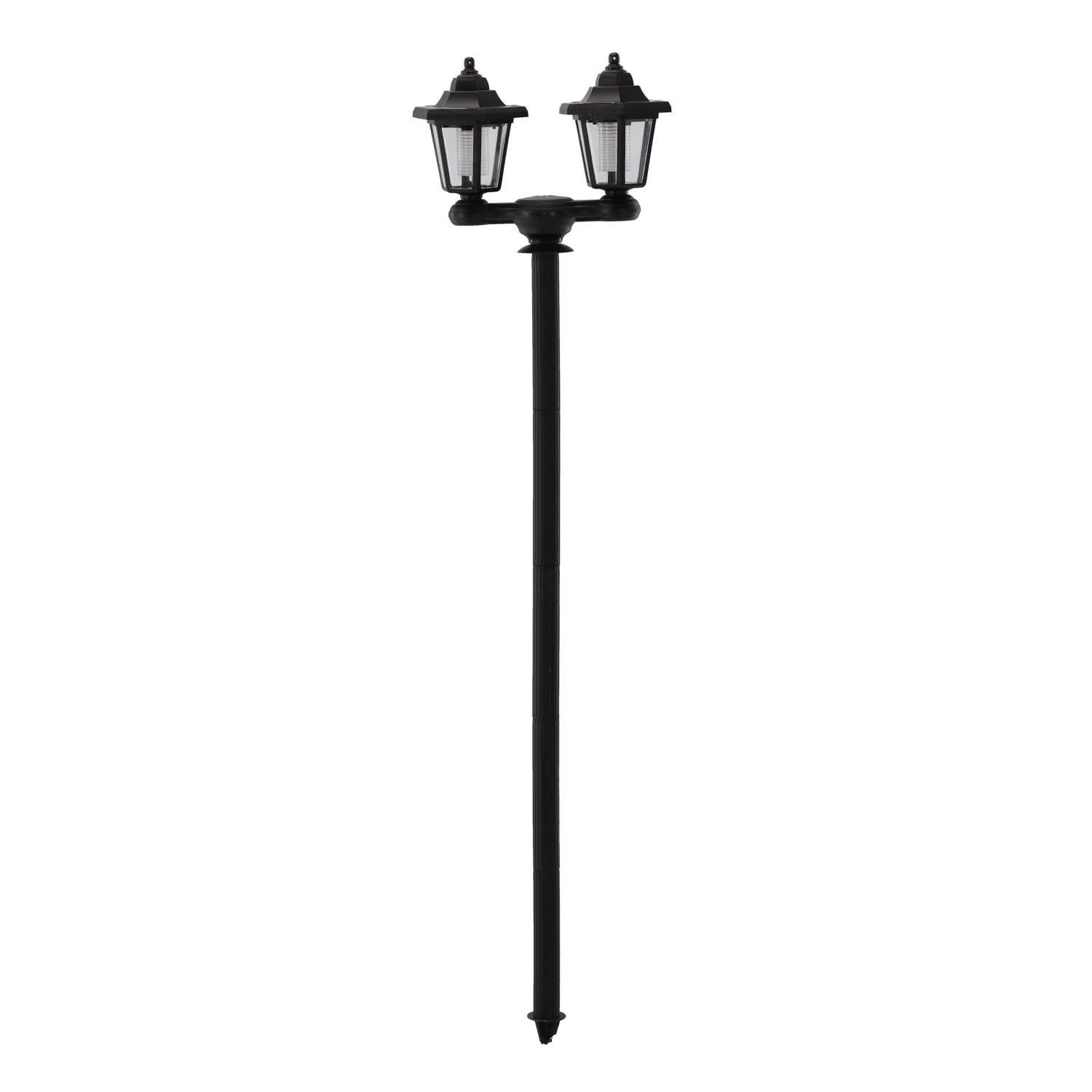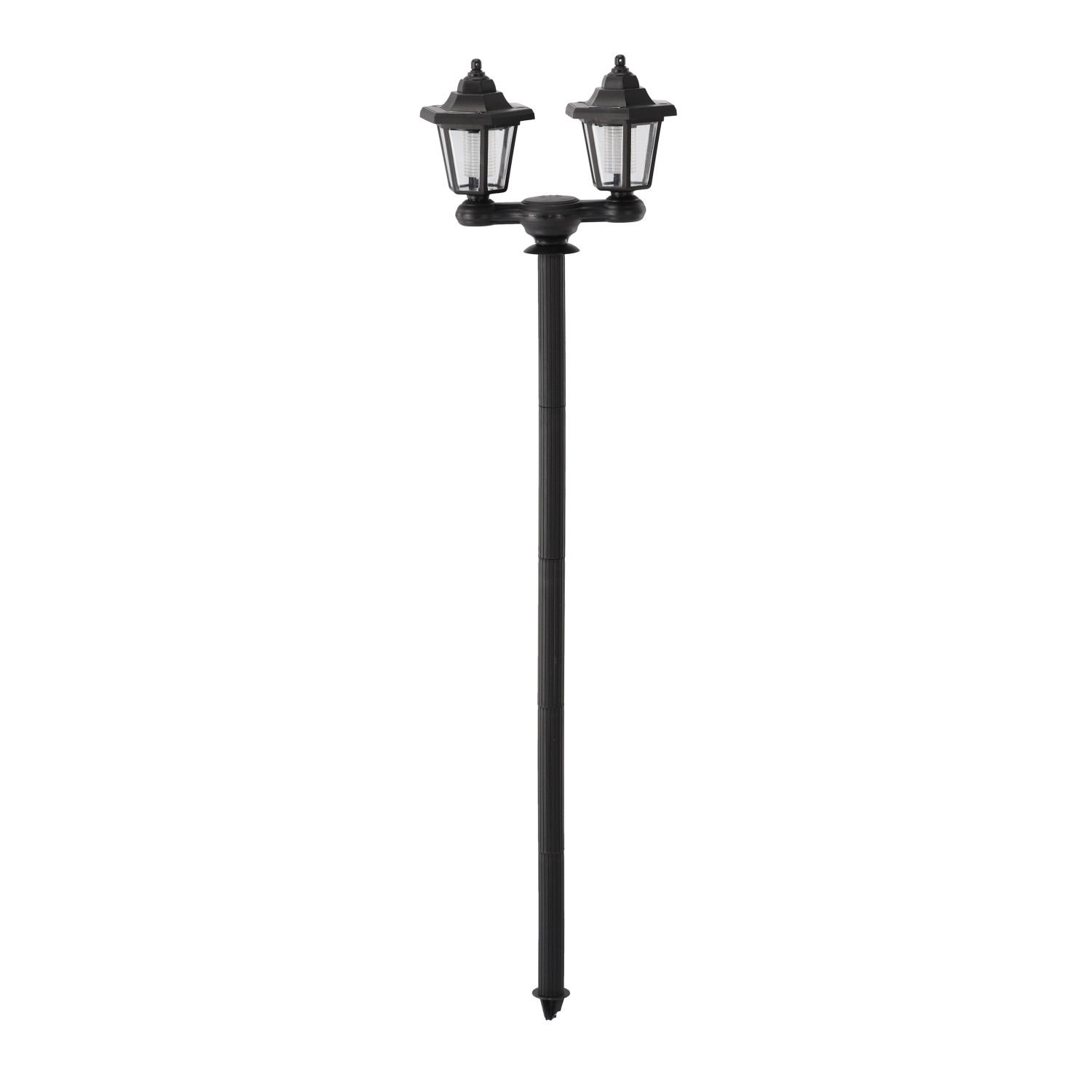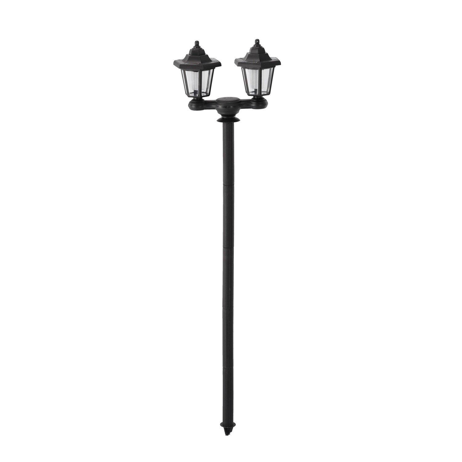 Сонячні лампи з двома головками на стовпіГоловку можна відкрутити і встановити як бра на стіні будівліРозміри виробу: 27,5x12,5x152 см, висота: 1,5 м2 білих світлодіодаУ комплекті батарея 1,2 В AA 400 мАг NI-MHПолікристалічний сонячний панель, IP44Час заряджання: 7-8 годинЧас роботи: 6-7 годин