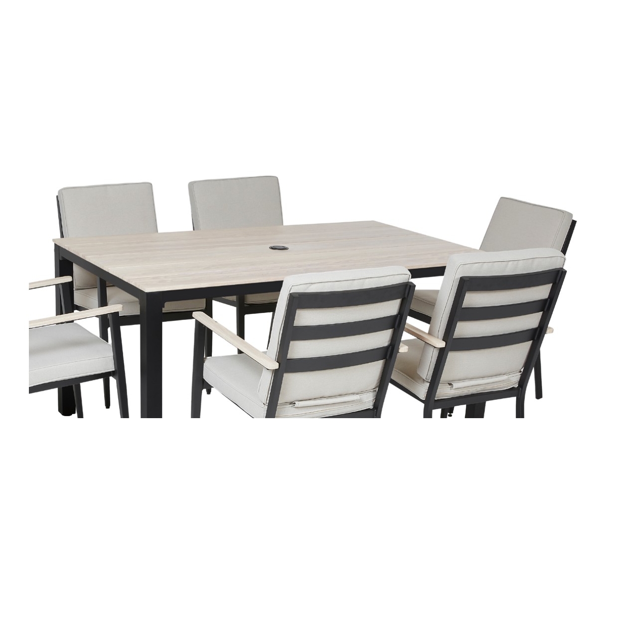 Матеріали:• Рама: алюміній• Подушки: тканина Olefin• Стільниця столу: алюмінієві планки з отвором для парасольки