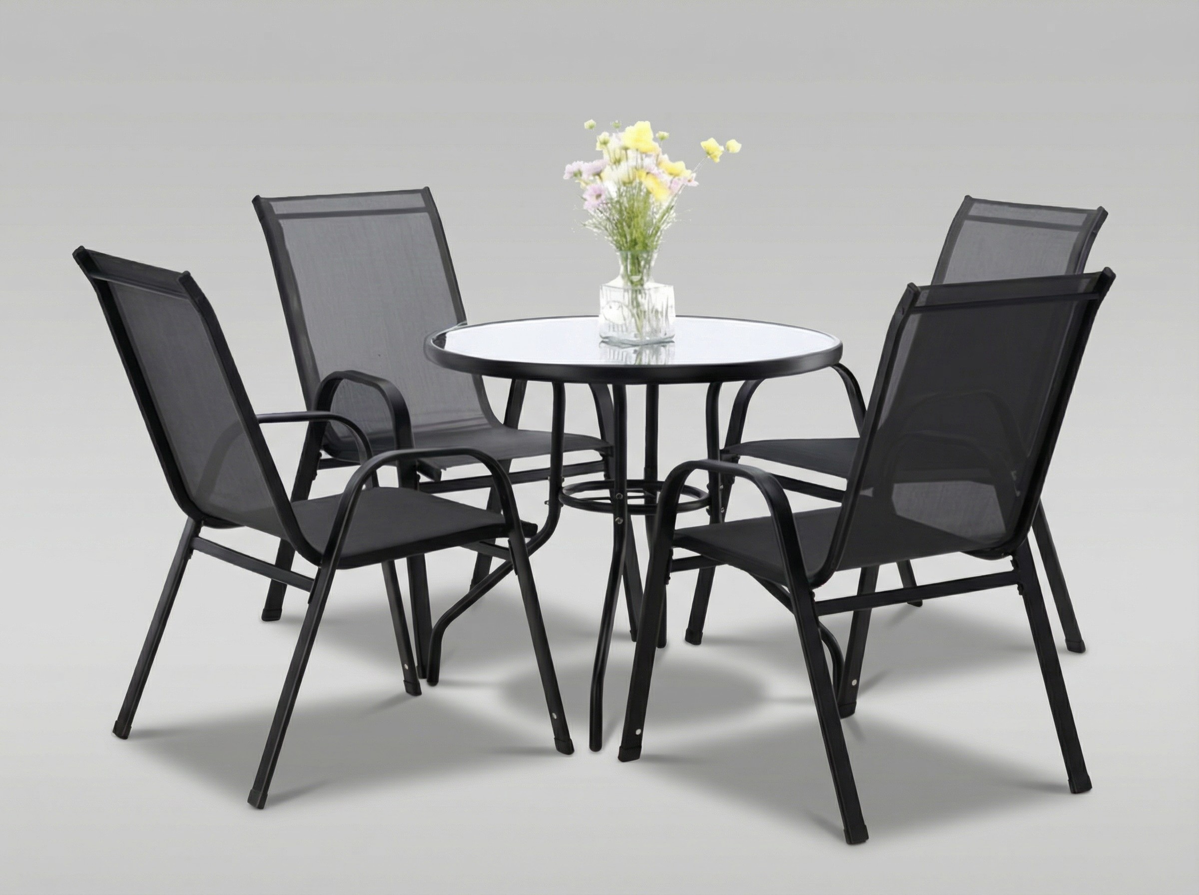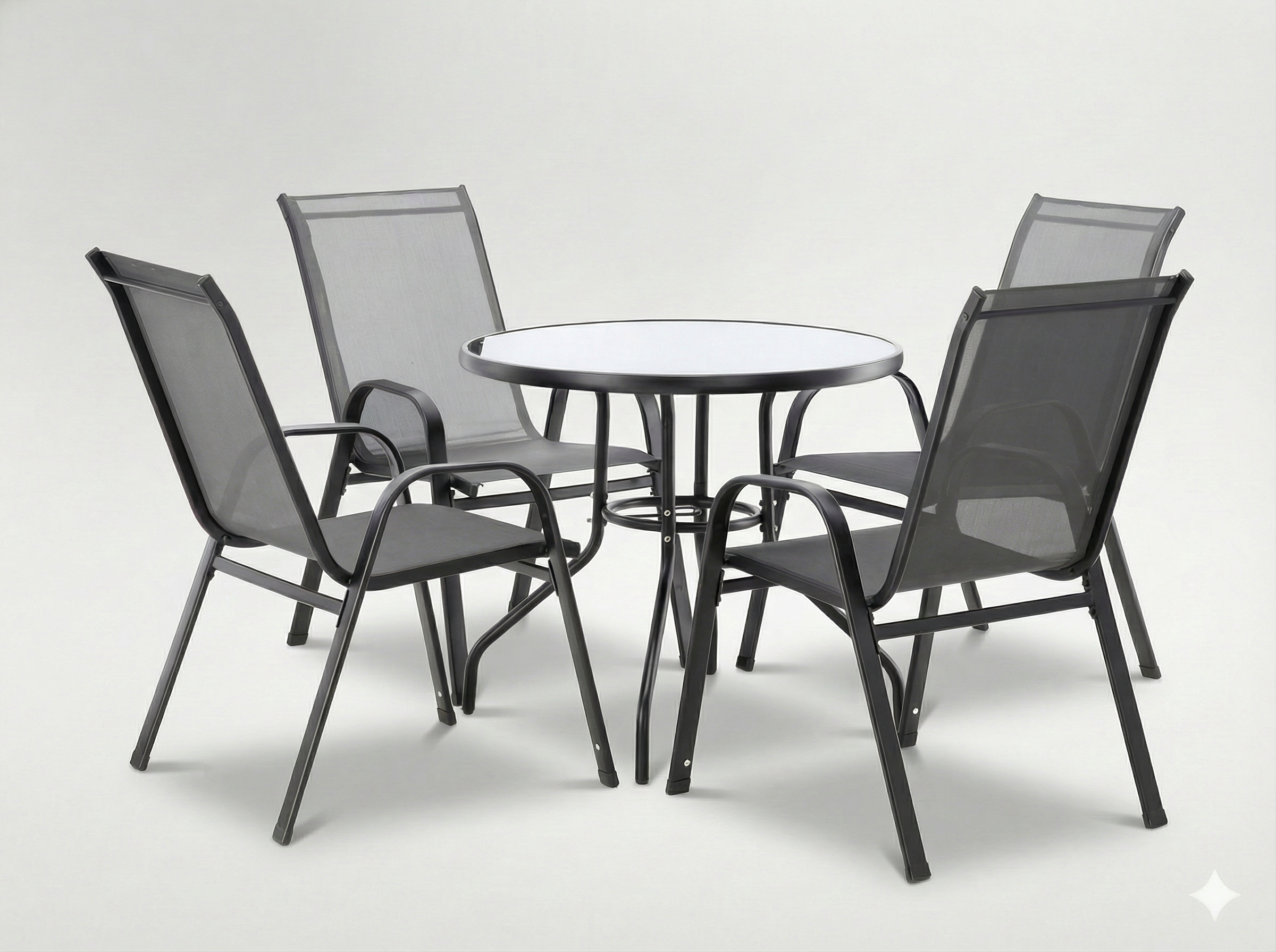 Комплект садових меблів сірого кольору, що складається з чотирьох зручних стільців та елегантного круглого столика зі скляною стільницею. Завдяки міцній конструкції та використанню довговічних матеріалів, комплект ідеально підійде для тераси, балкона або саду. Практичні розміри та сучасний дизайн гарантують комфорт використання та естетичний вигляд протягом тривалого часу.