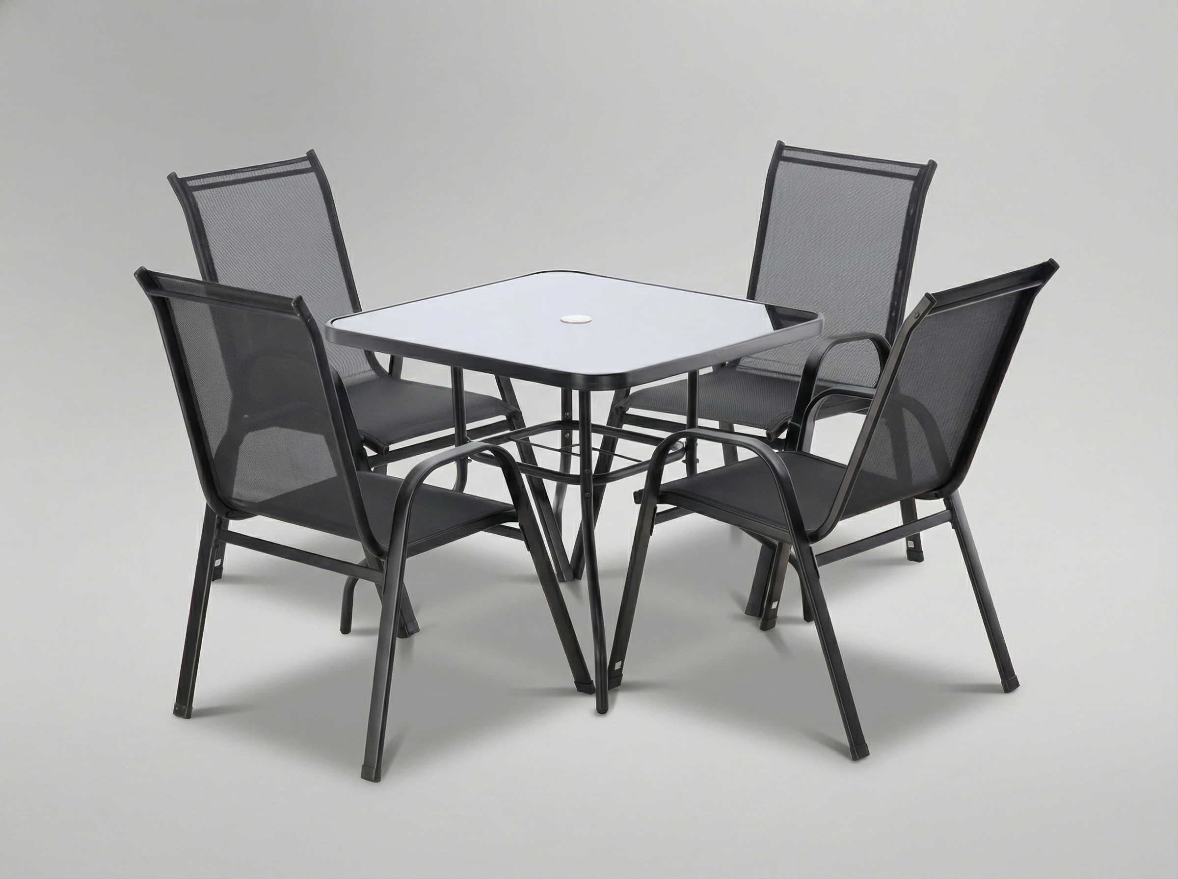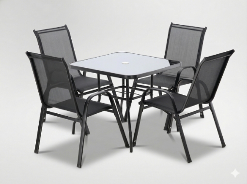 Сучасний комплект садових меблів чорного кольору, що складається з чотирьох зручних стільців та квадратного столика зі скляною стільницею. Міцна конструкція з порошкового фарбованого сталі та стійкі до атмосферних умов матеріали роблять цей комплект ідеальним для саду, тераси або балкона. Комфорт використання та елегантний вигляд гарантують задоволення на довгий час.