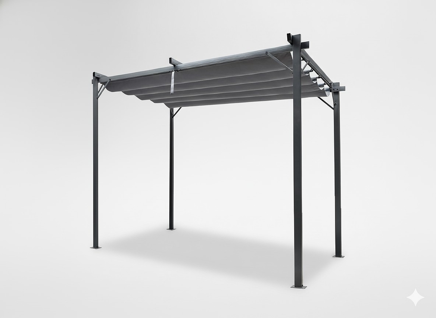 Каркас нашої перголи виготовлений з порошковим покриттям сталевих профілів, що гарантує міцність і стабільність конструкції. Покриття, в свою чергу, виготовлене з товстої поліестерової тканини щільністю 300 г/м2, яка забезпечує не тільки захист від сонця, але і від легкого дощу, завдяки своїй водонепроникній конструкції.