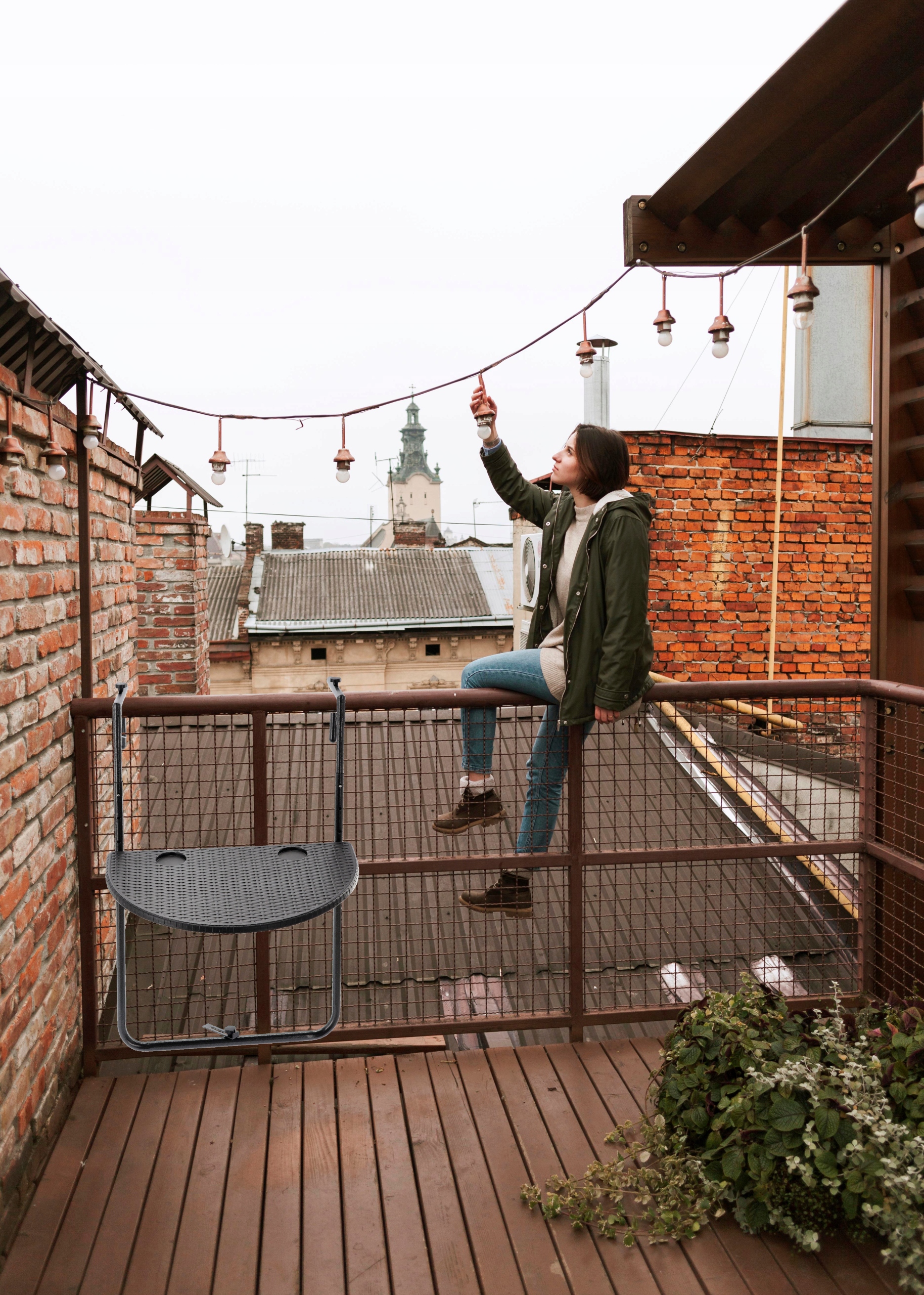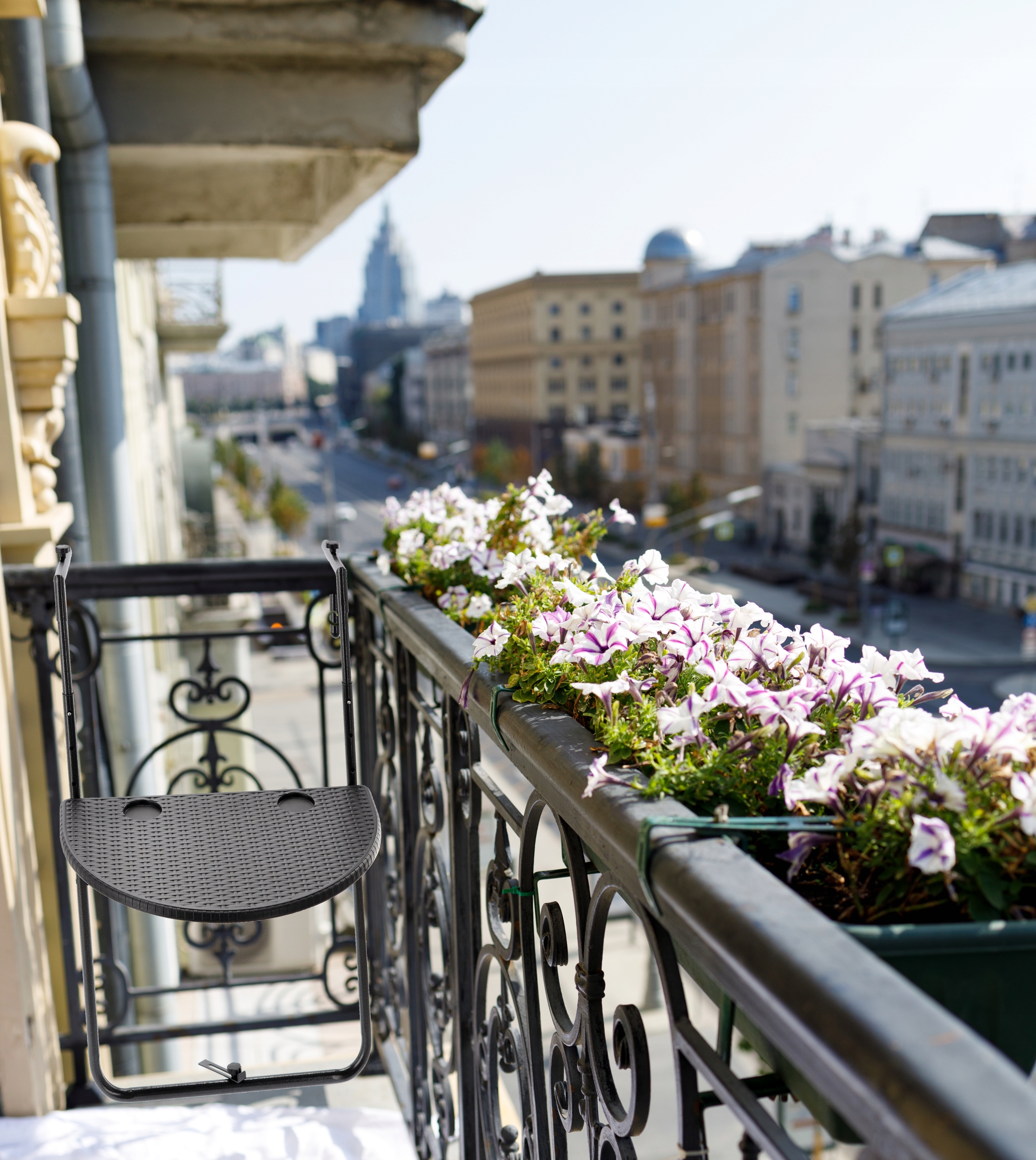 Столик був створений спеціально для підвішування на балюстраді балкона, не займаючи цінну площу підлоги. Монтаж надзвичайно простий, а регулювання кріплення дозволяє прикріпити столик до рам балюстради шириною від6,5 до 16 см.