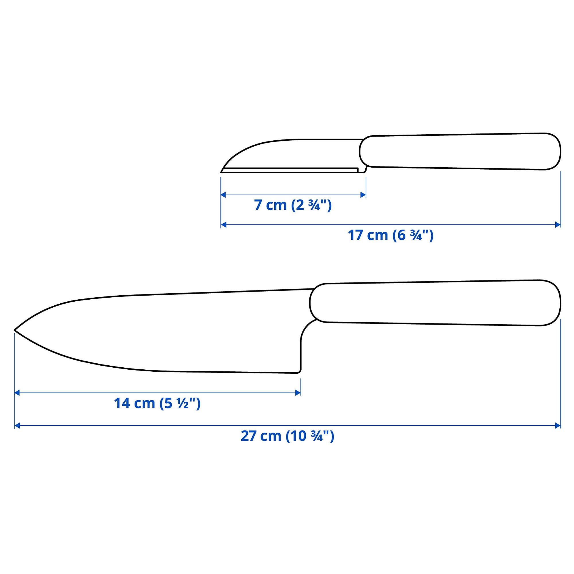У комплекті: ніж шеф-кухаря 14 см (загальна довжина 27 см) та ніж для чищення овочів 7 см (загальна довжина 17 см).
