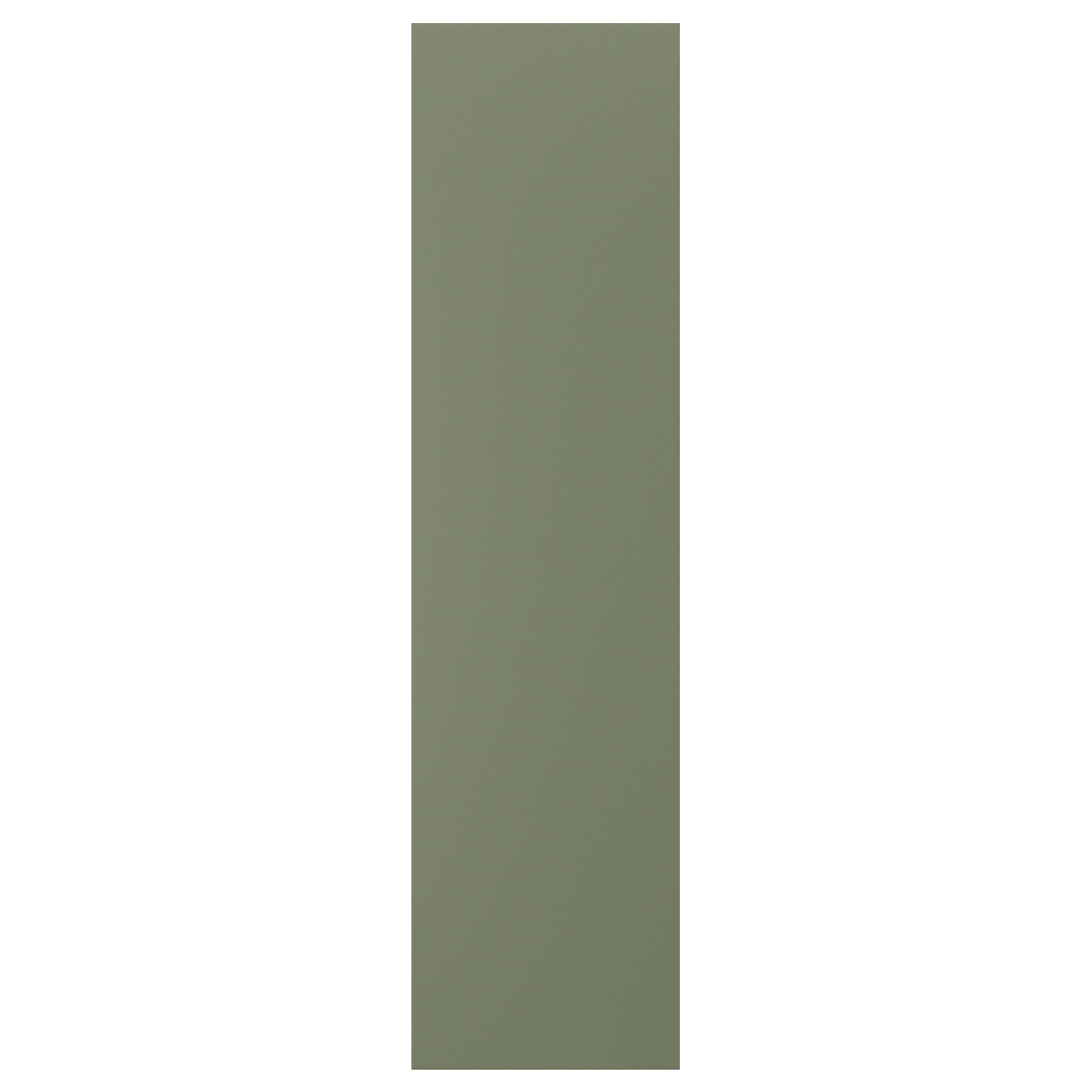 Маскувальні панелі в тому ж матовому сіро-зеленому відтінку, що і фасади, уніфікують стиль кухні та підкреслюють її дизайн.