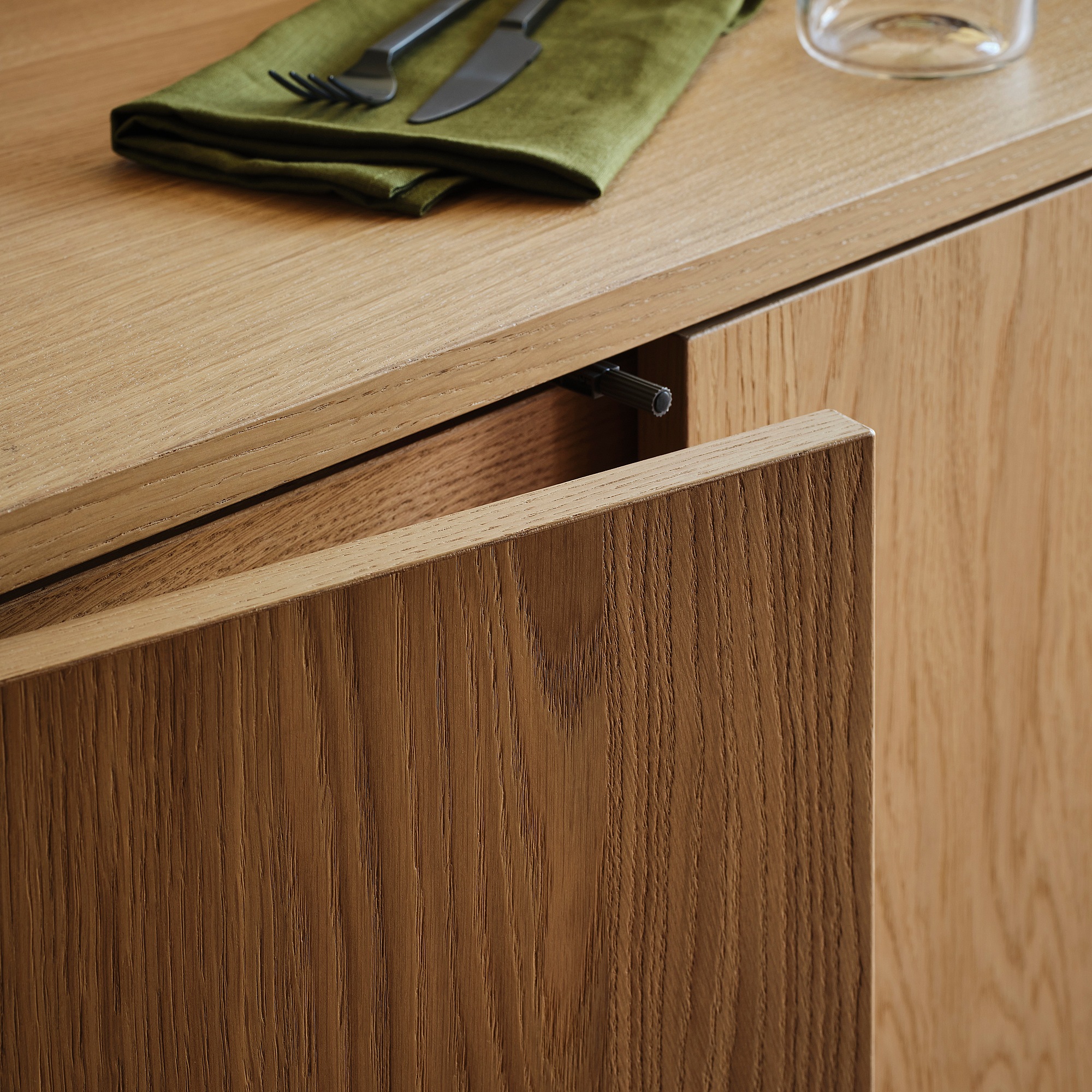 Стильний уклін у бік скандинавського дизайну. Сервант STOCKHOLM 2025 має гарне оздоблення та багато місця для зберігання. Дерев'яні направляючі висувних ящиків підкреслюють ремісничий характер меблів.