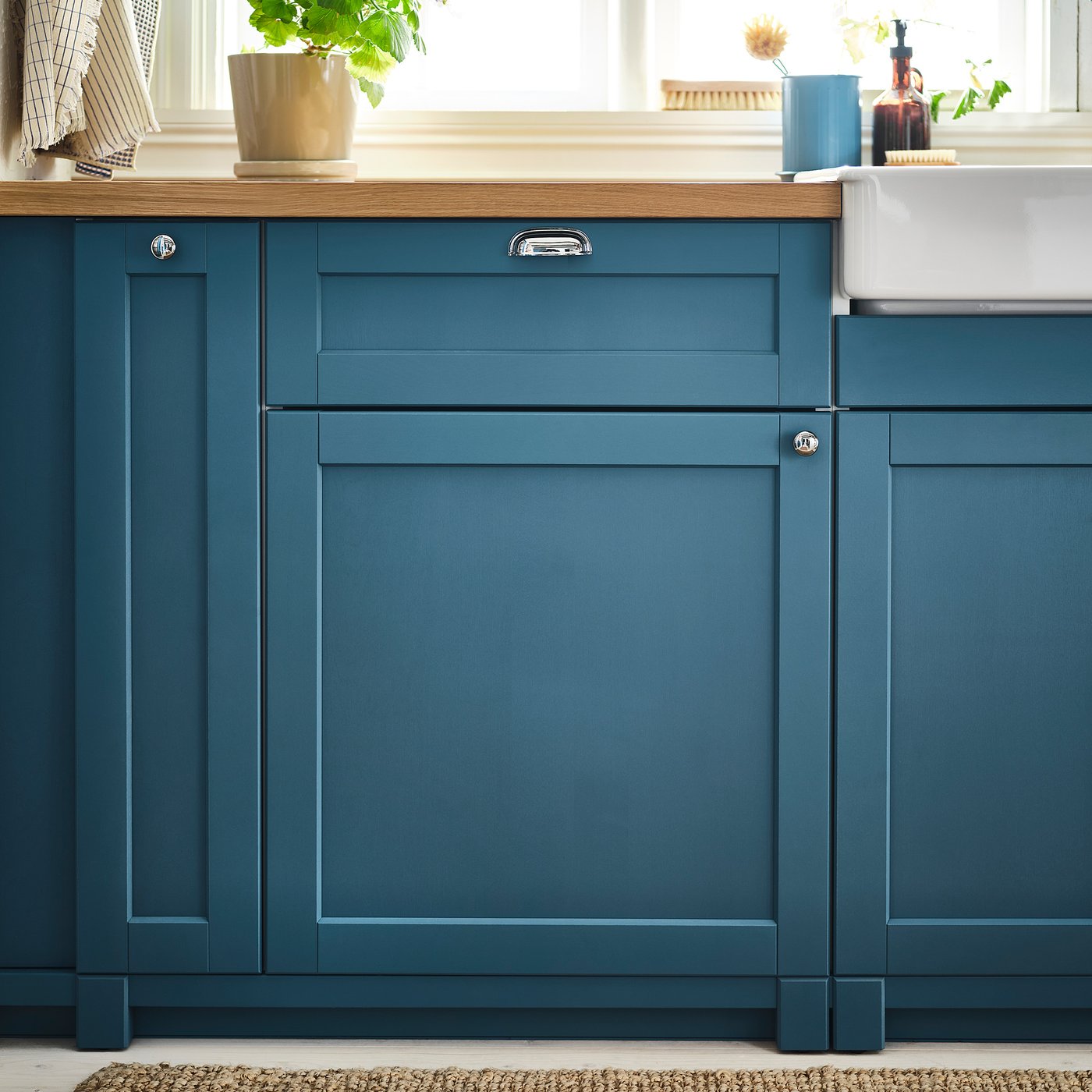 Рама з масиву дерева зі скошеними краями та вставною панеллю з шпоном надають кухонним фасадам LERHYTTAN позачасовий, традиційний вигляд. Синє оздоблення додає кухні теплий, особистий характер.
