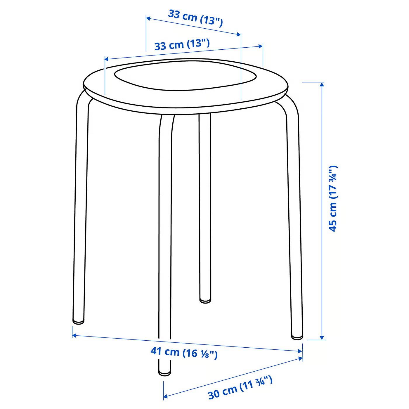 Діаметр сидіння: 33 смВисота сидіння: 45 смПеревірено для: 100 кгШирина: 41 смЦей виріб може потребувати складання.