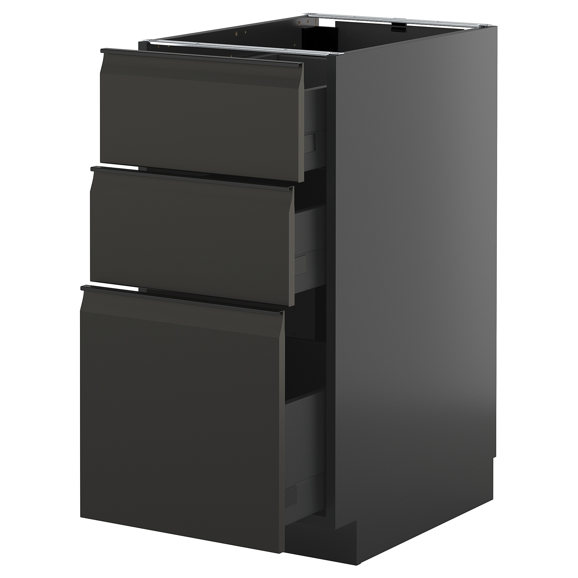Система METOD надає необмежені можливості для проектування кухні вашої мрії. У поєднанні з фасадами UPPLÖV у матовому чорному кольорі з інтегрованою ручкою та скошеними краями ви отримаєте сучасний графічний вигляд.