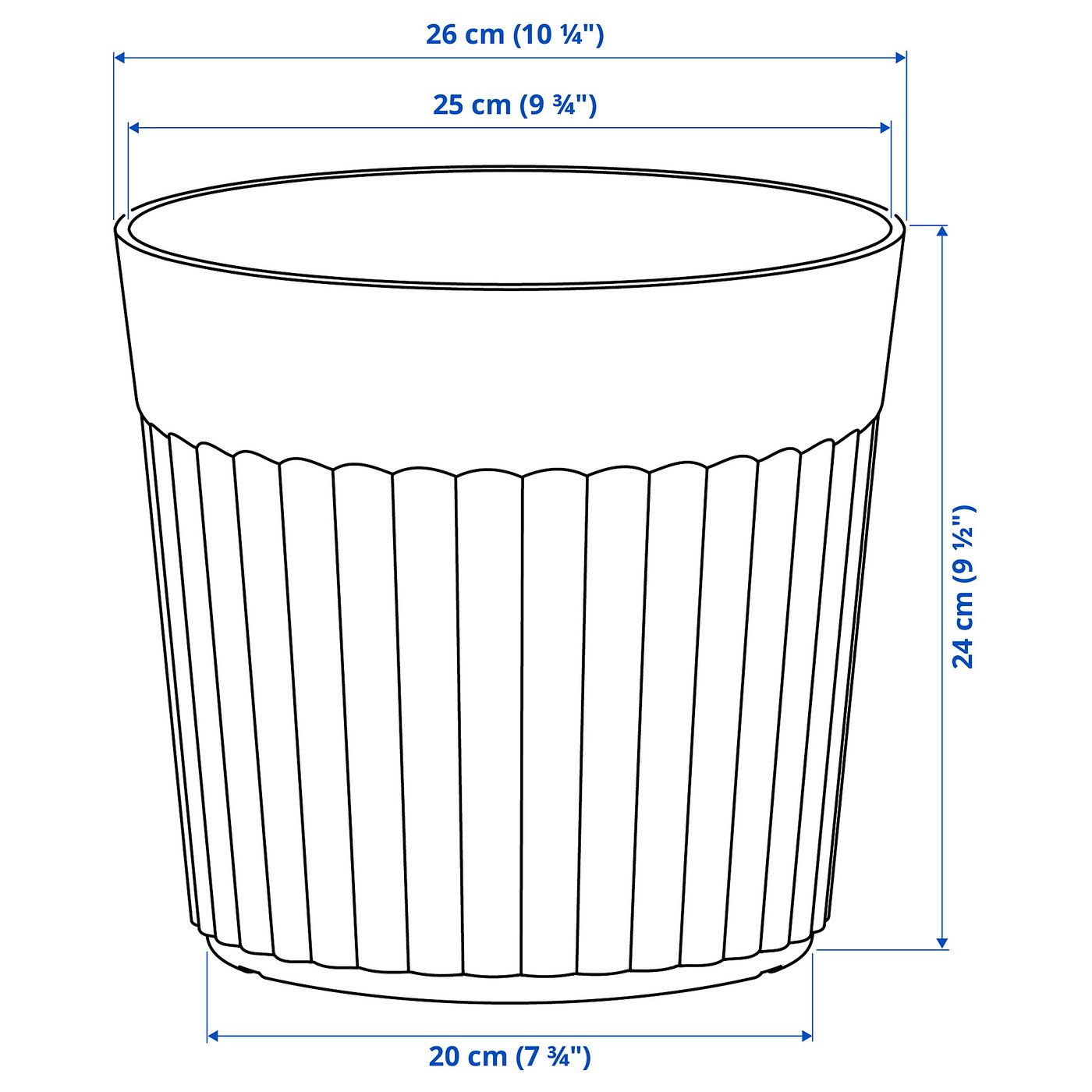 Висота: 24 смВнутрішній діаметр: 25 смМакс. діаметр горщика: 24 смЗовнішній діаметр: 26 см