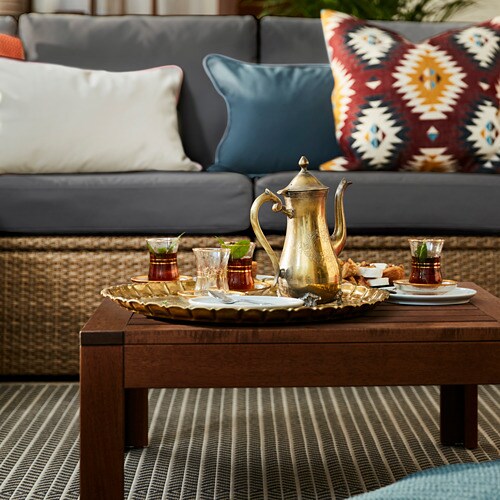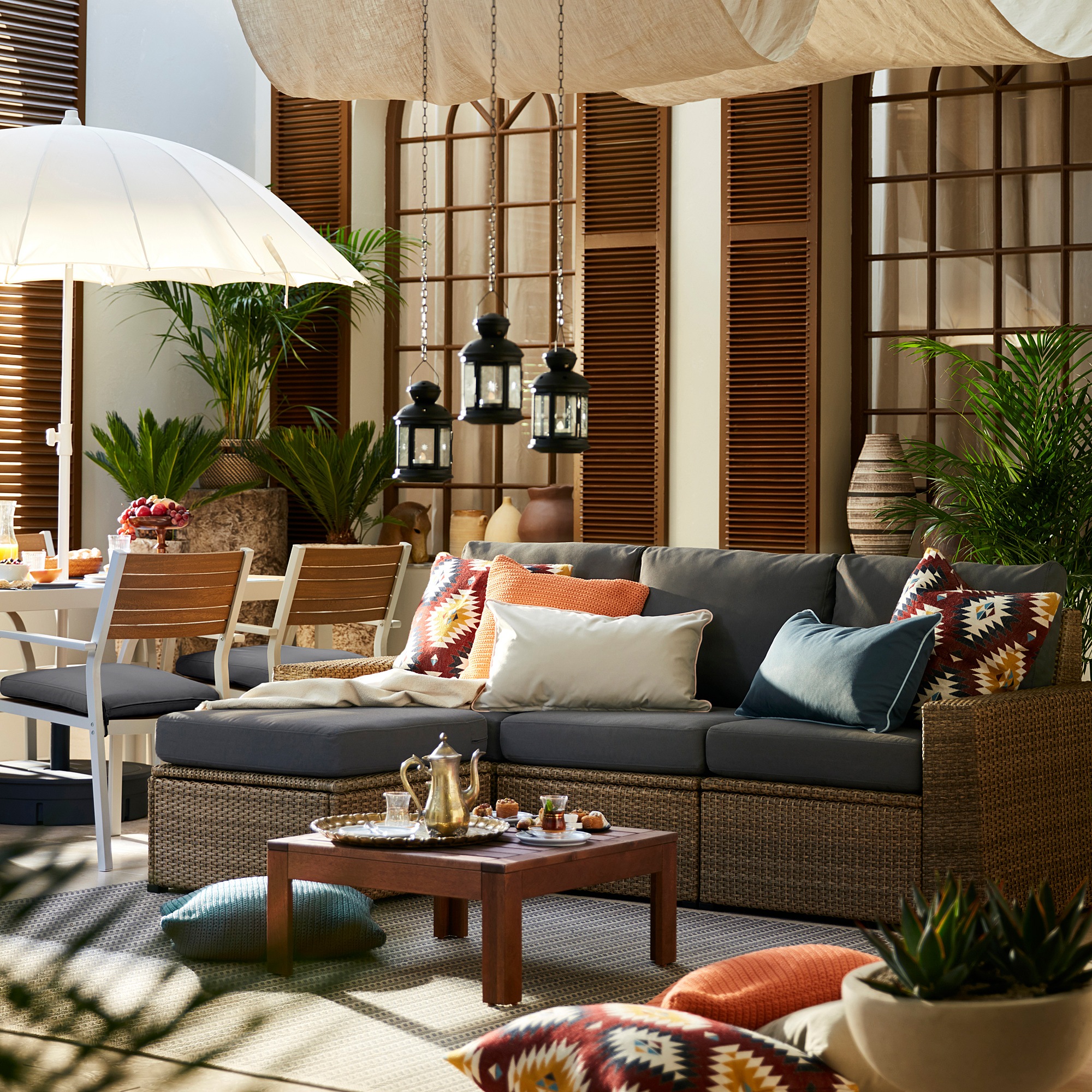 Створіть вітальню просто неба за допомогою модульних секцій SOLLERÖN. Зручний шезлонг, штучний ротанг, що не потребує догляду, і стійкі до вицвітання подушки створюють відчуття комфорту.