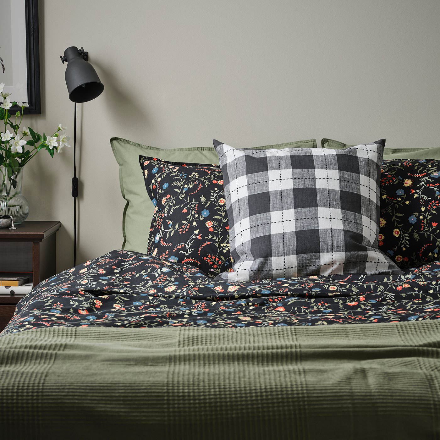 Наволочка SVAMPFLY з традиційною антрацитовою клітинкою створює затишну атмосферу на ліжку, дивані або улюбленому кріслі. Виткана з фарбованої бавовняної пряжі та прикрашена відчутними на дотик швами.