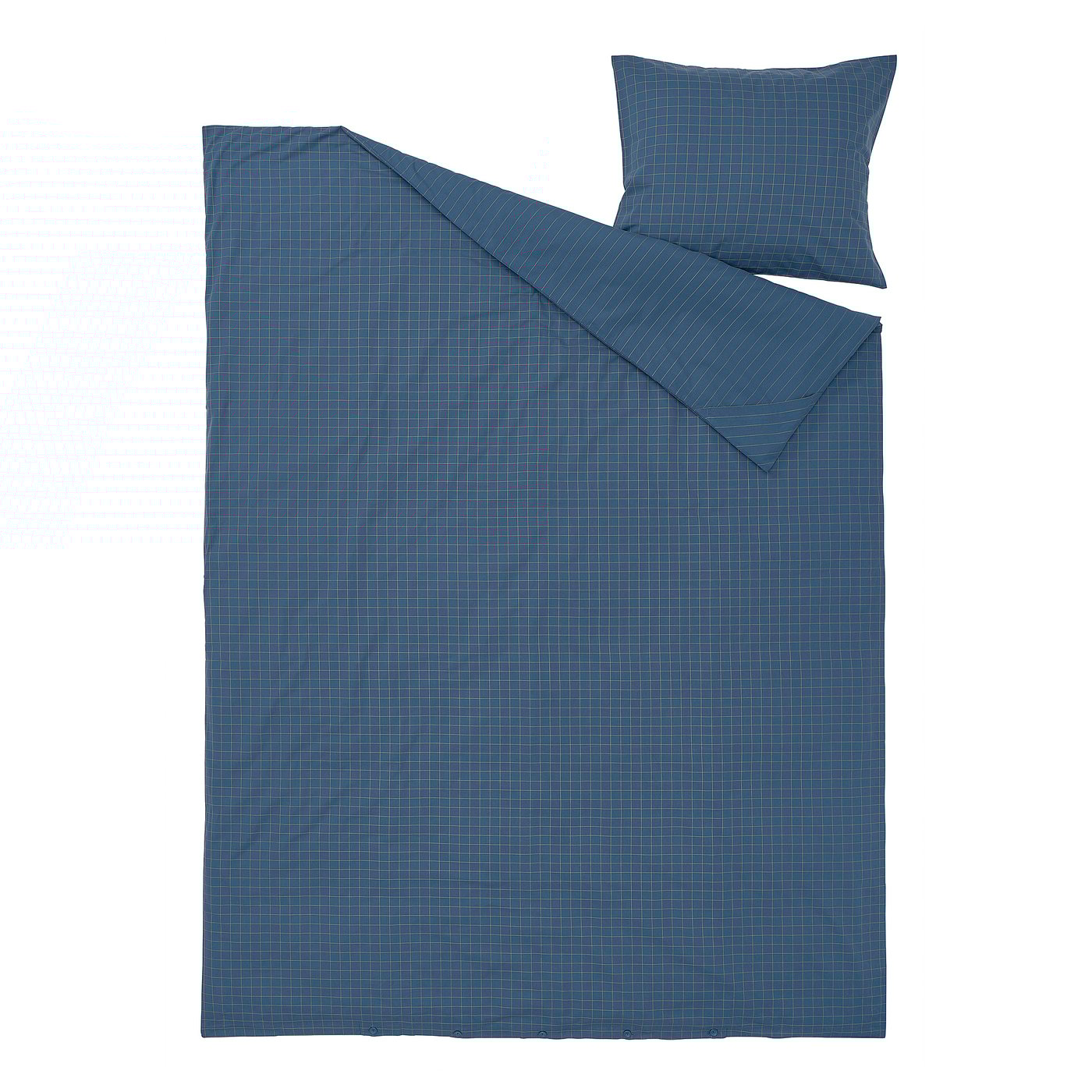 Комплект темно-синьо-світло-коричневої постільної білизни DOFTAKLEJA прикрашений прострочкою у вигляді клітинки з одного боку та смужок з іншого. Закриті кишенями отвори в кутах полегшують вкладання ковдри в ковдру.