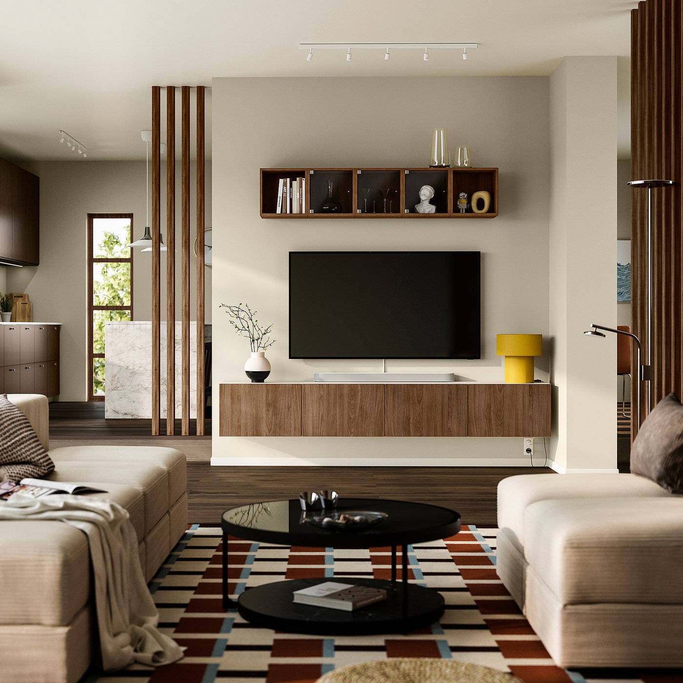 Багато місця для зберігання та зручна організація кабелів. Ця настінна тумба під телевізор — це стильне та функціональне рішення, яке складається з трьох корпусів. На ній можна розмістити навіть великий телевізор.
