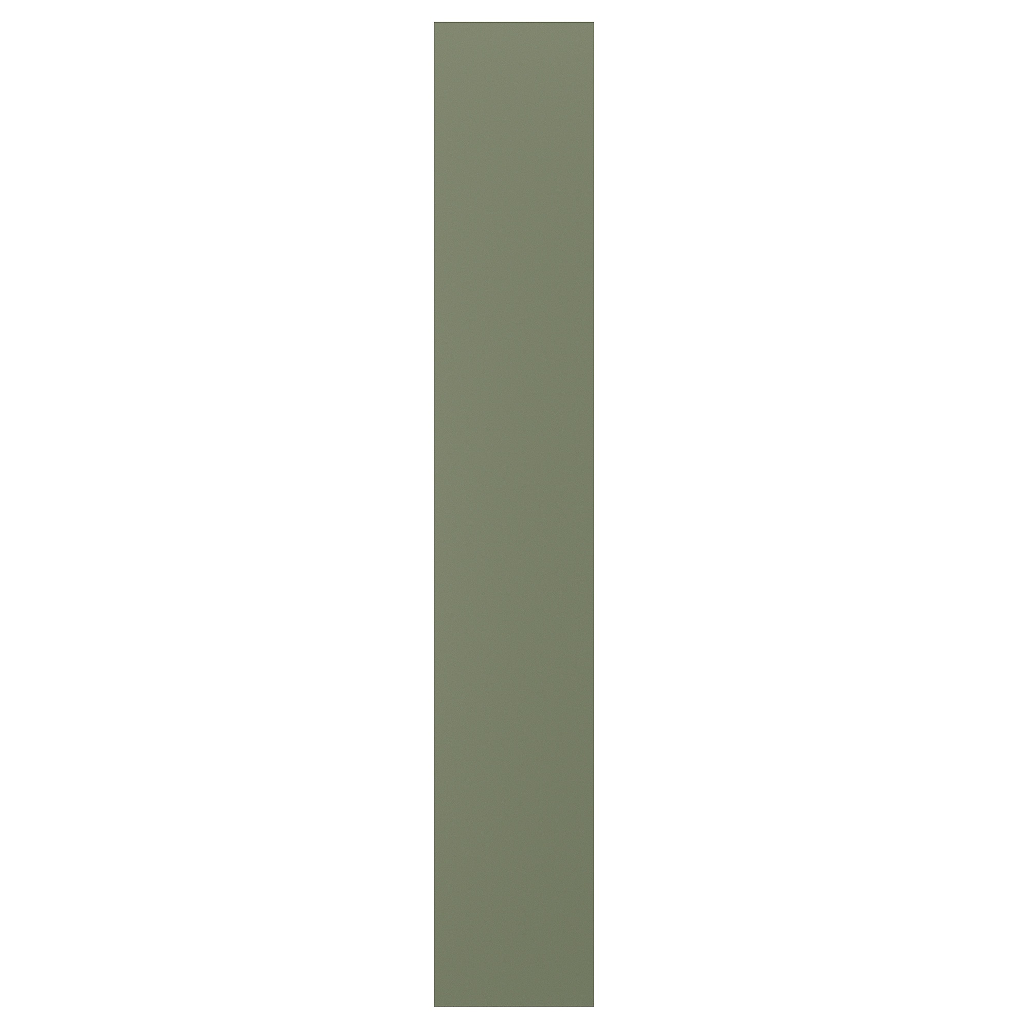 Маскувальні панелі в тому ж матовому сіро-зеленому відтінку, що і фасади, уніфікують стиль кухні та підкреслюють її дизайн.