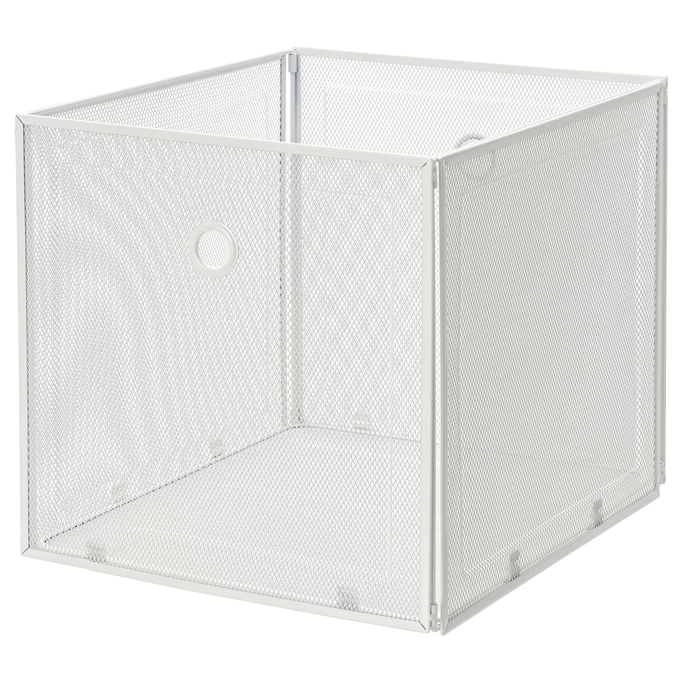 Біла металева коробка для зберігання допомагає підтримувати порядок. Сітка дозволяє бачити, що знаходиться всередині, а розмір ідеально підходить для стелажа KALLAX.