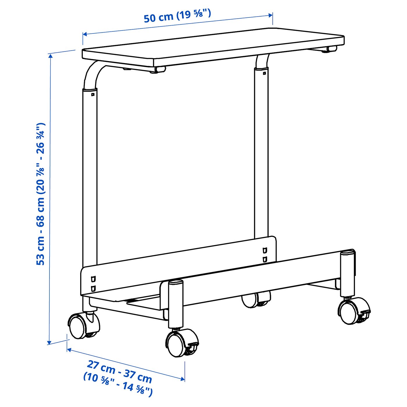Мінімальна висота: 53 смМінімальна ширина: 27 смМаксимальна висота: 68 смМаксимальна ширина: 37 смМакс. навантаження, верхня полиця: 5 кгМакс. навантаження, нижня полиця: 25 кгГлибина: 50 смЦей виріб може потребувати складання.