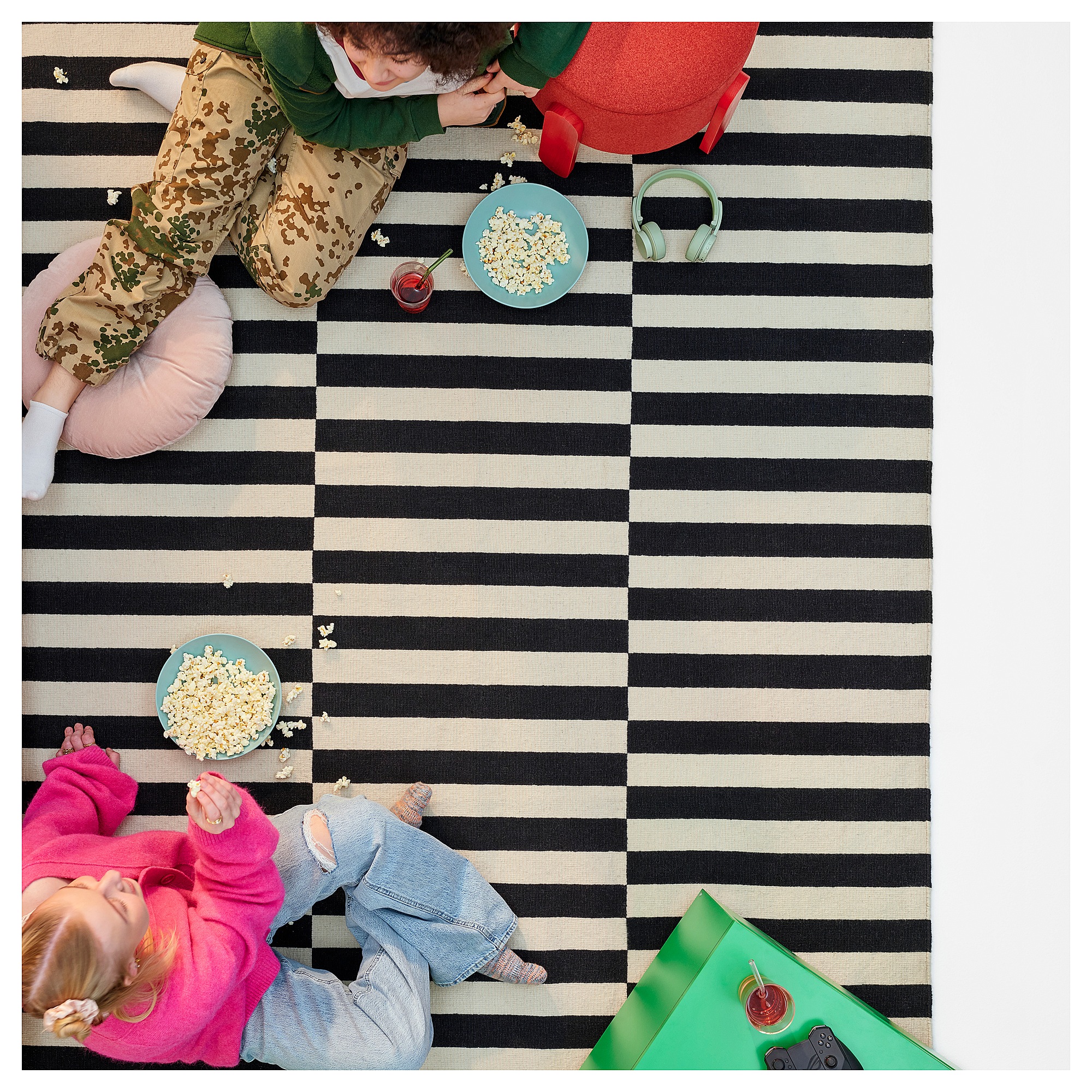 Чорно-білий візерунок з асиметричними смугами заворожує погляд. Ручне ткацтво з вовни кваліфікованими майстрами робить кожен килим унікальним. Плоске плетіння ідеально підходить для їдальні та вітальні.