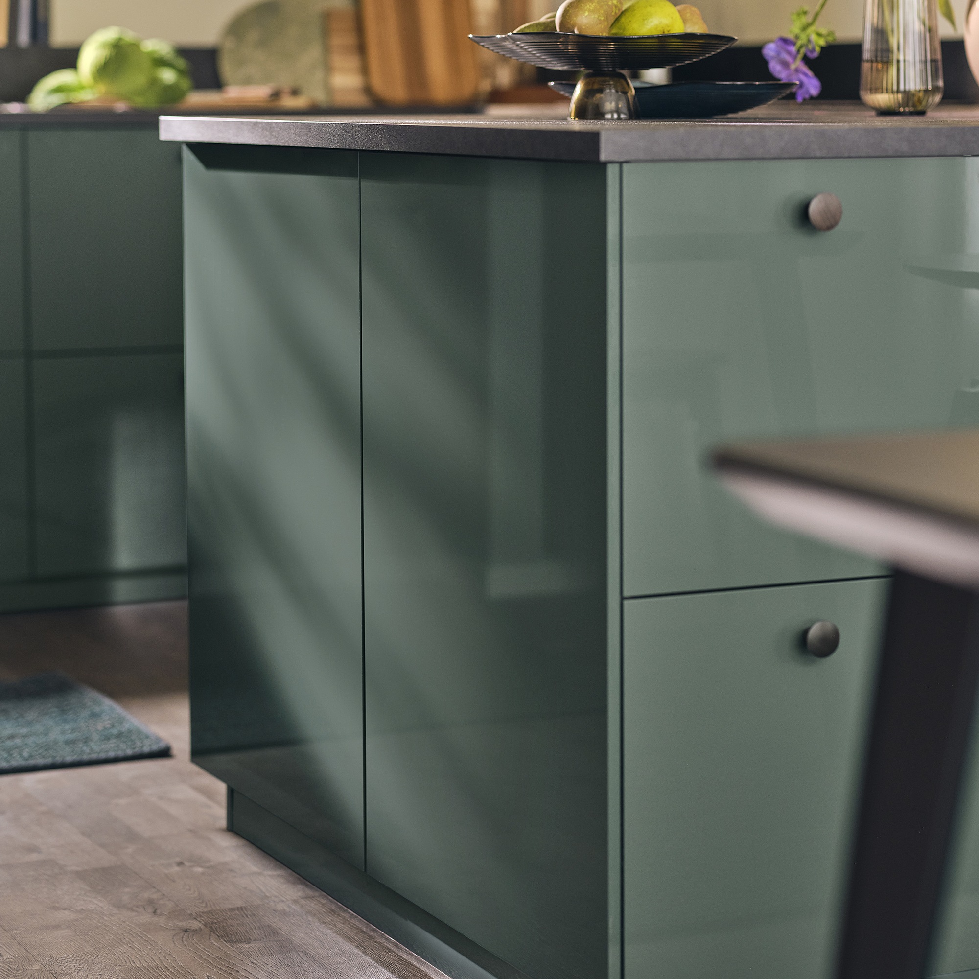 Ця маскувальна панель ідеально пасує до сіро-зелених фасадів KALLARP з високим глянцем, надаючи кухні ультрасучасного вигляду. Виготовлена частково з матеріалів, що походять з переробки, на заводах, які працюють виключно на енергії з відновлюваних джерел.