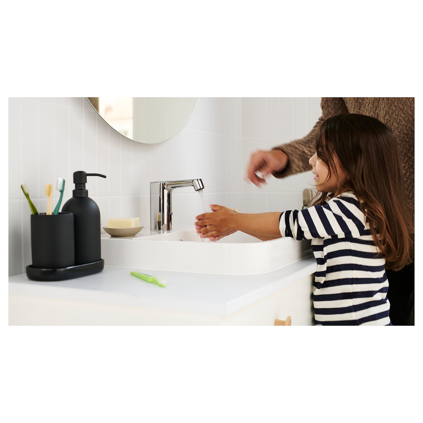 У комплекті: 1 дозатор мила, 49 мл (діаметр 8 см, висота 20 см), 1 чашка для зубних щіток (діаметр 8 см, висота 11 см) і 1 піддон (довжина 18 см, глибина 9 см).