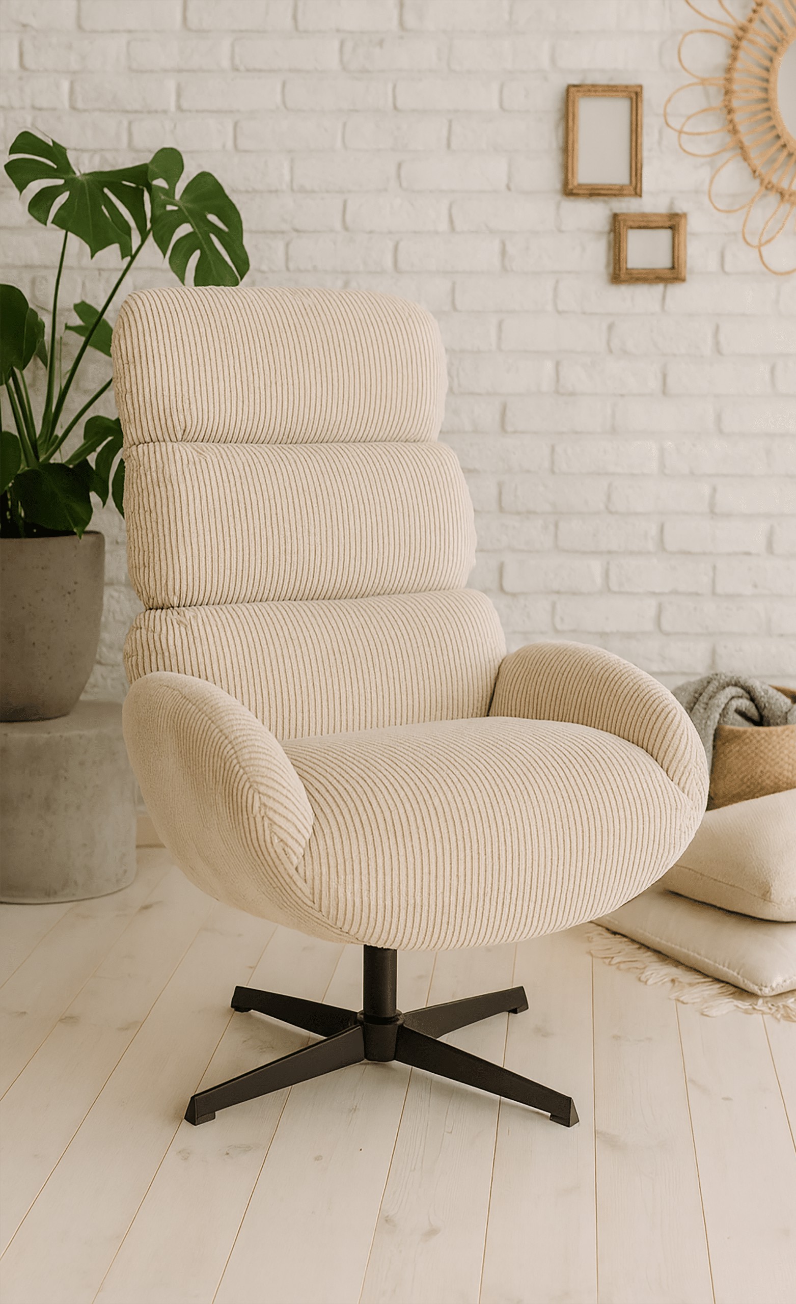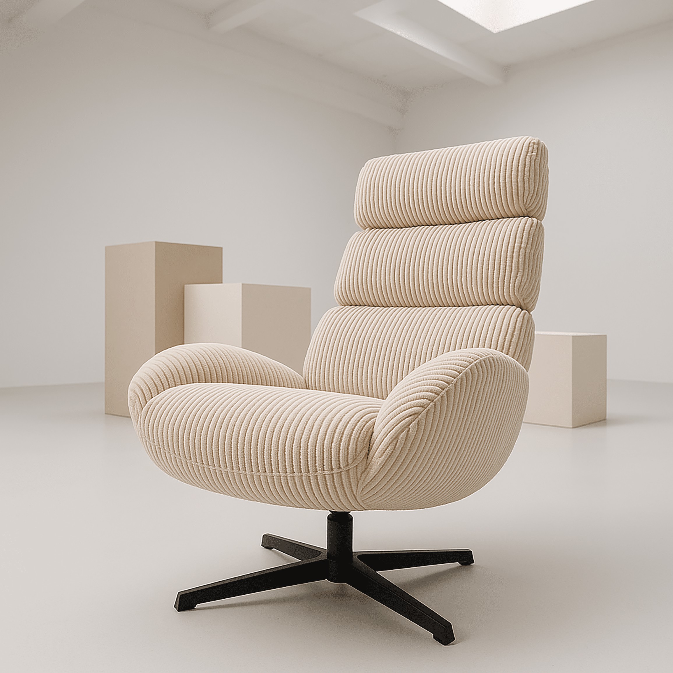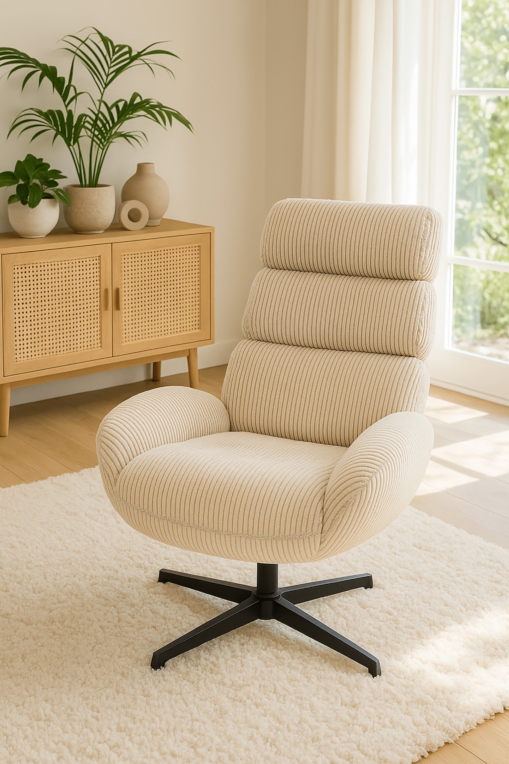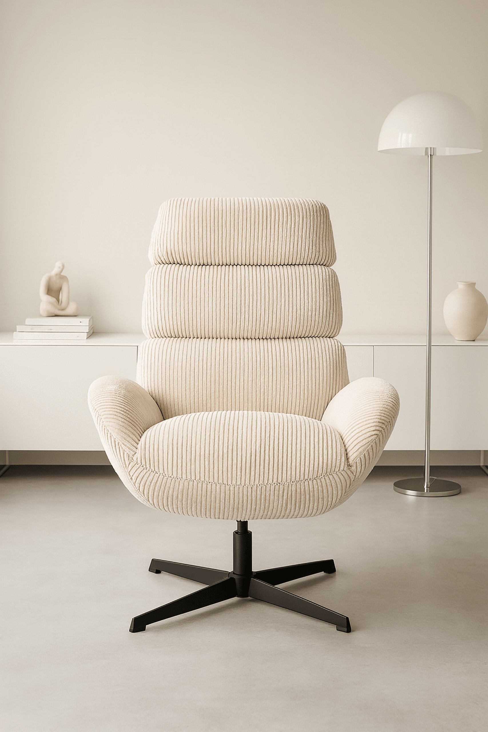 Крісло AXEL FO102 кольору екрю з оббивкою зі штруксу — це поєднання зручності, сучасного дизайну та довговічності. Профільована спинка з декоративними вертикальними лініями забезпечує ідеальну підтримку спини, а чорна сталева основа типу хреста з функцією обертання на 360° забезпечує повну свободу руху без необхідності пересувати крісло.