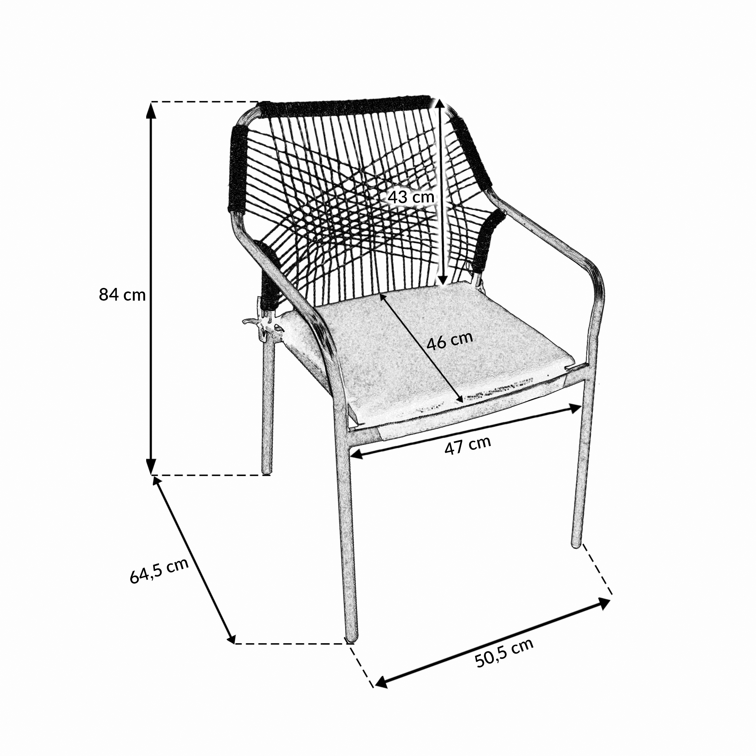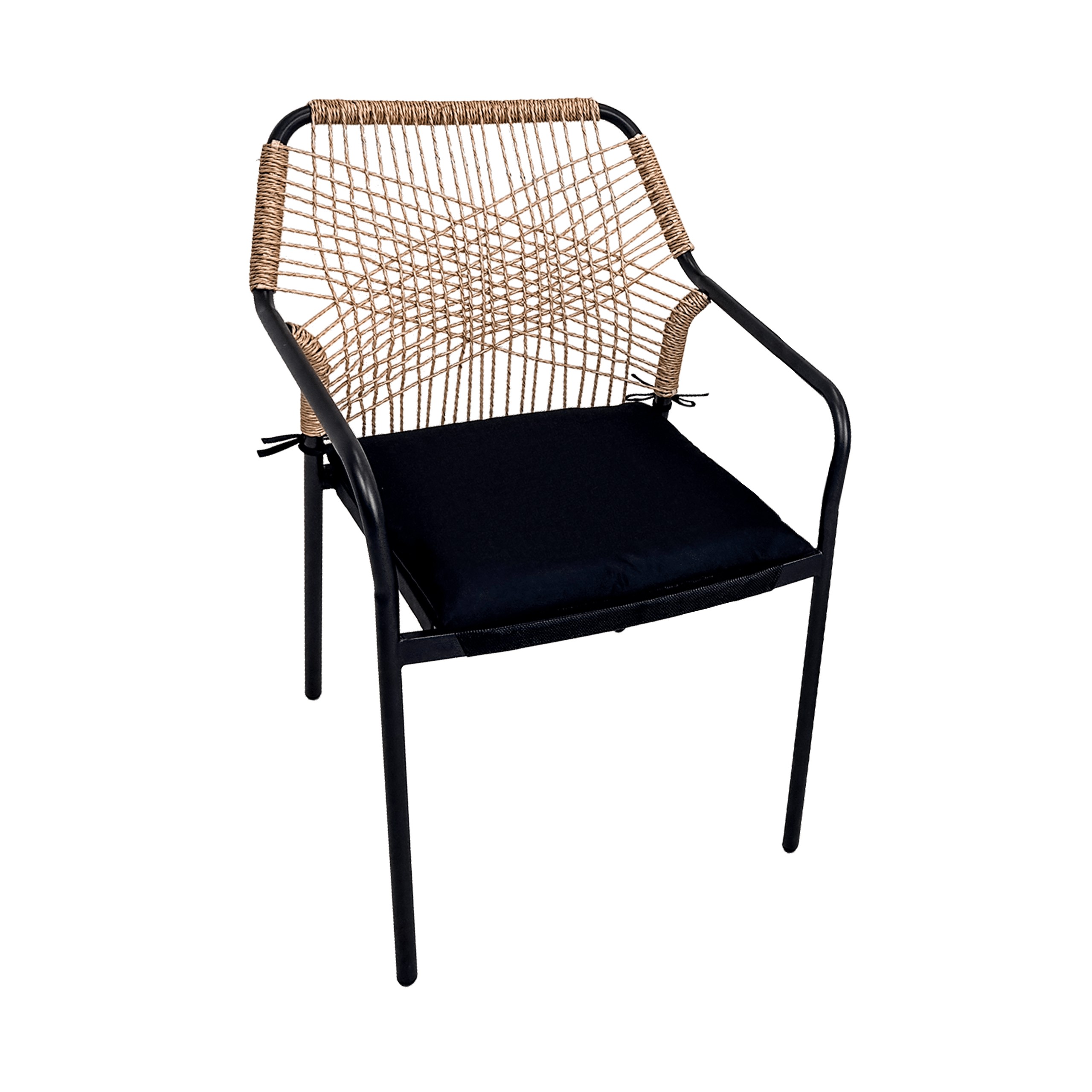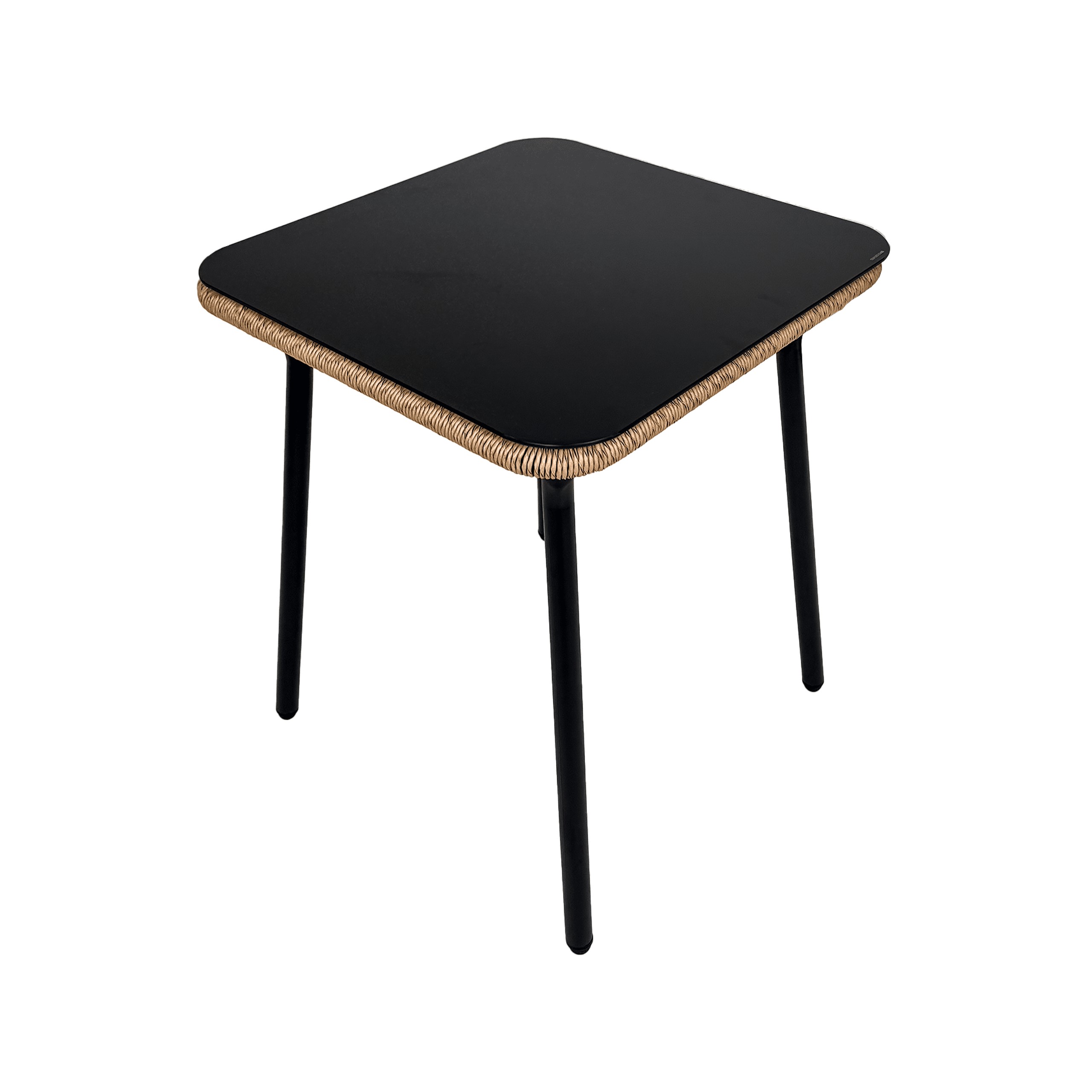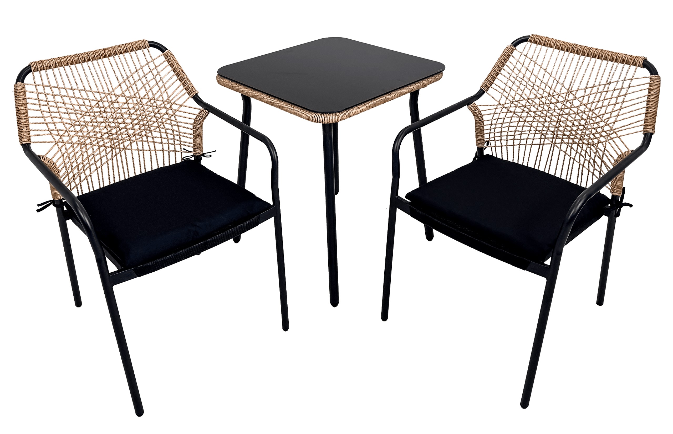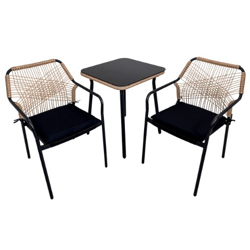 Колір: стільці – чорні з натуральною мотузкою, стільниця столика – чорна