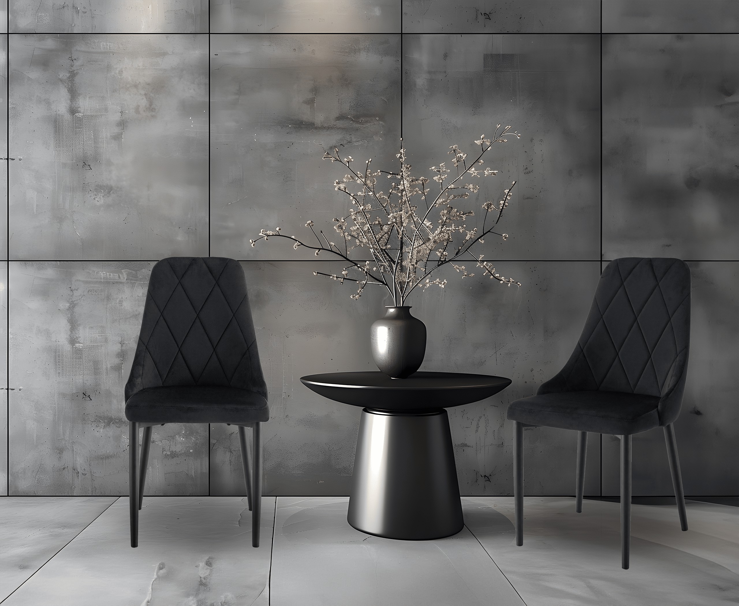 Розміри: Висота: 89 см Ширина: 46 см Глибина: 58 см Висота сидіння: 47 см Ширина сидіння: 44 см Глибина сидіння: 42 см Розташування ніжок: 41x43,5x60 см Ніжки: сталь, пофарбована порошковою фарбою в чорний колір Сидіння: тканина вельвет 260 г/м² Рама: сталь, пофарбована порошковою фарбою в чорний колір Пінопласт 27 кг/м3 Максимальне навантаження: 120 кг