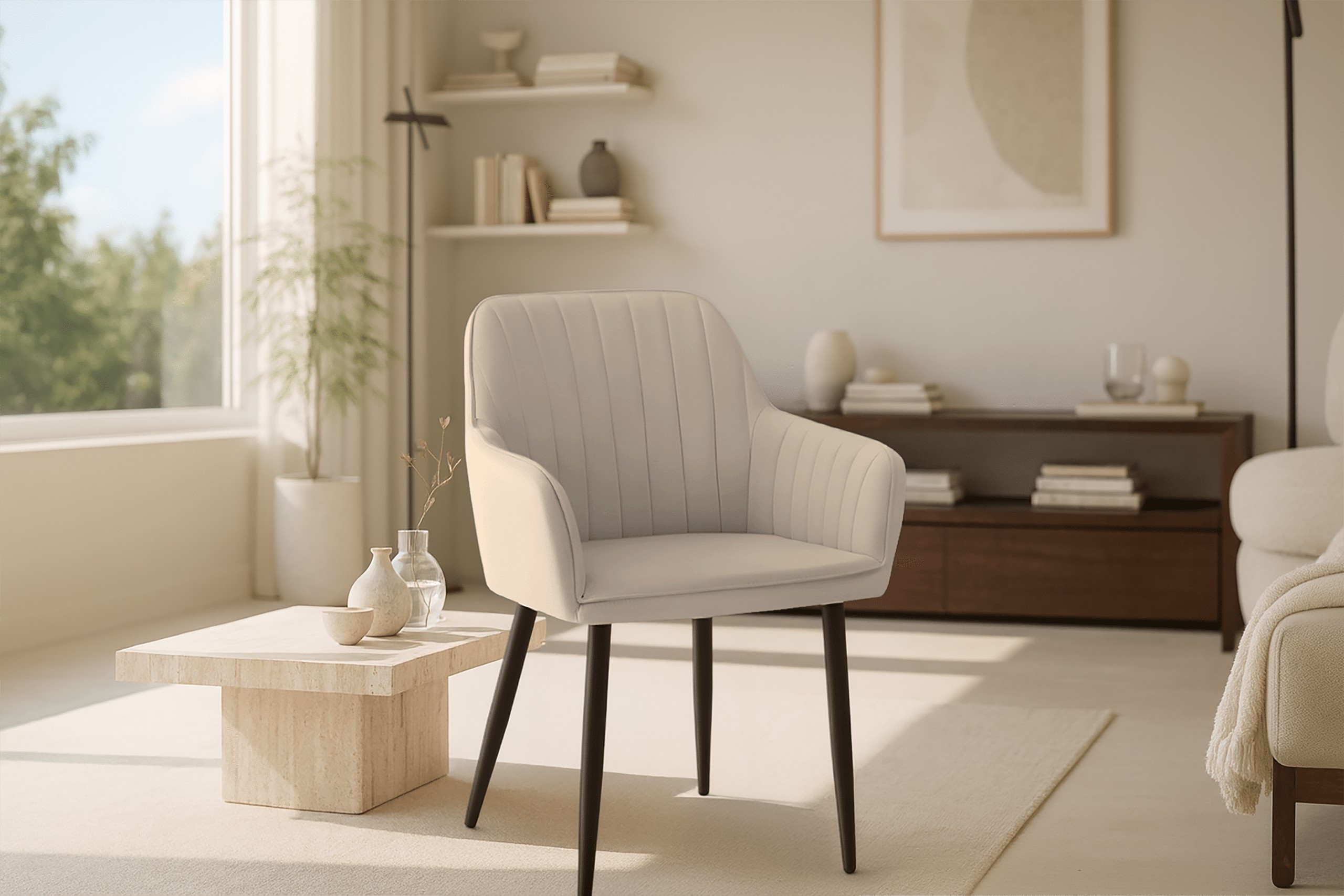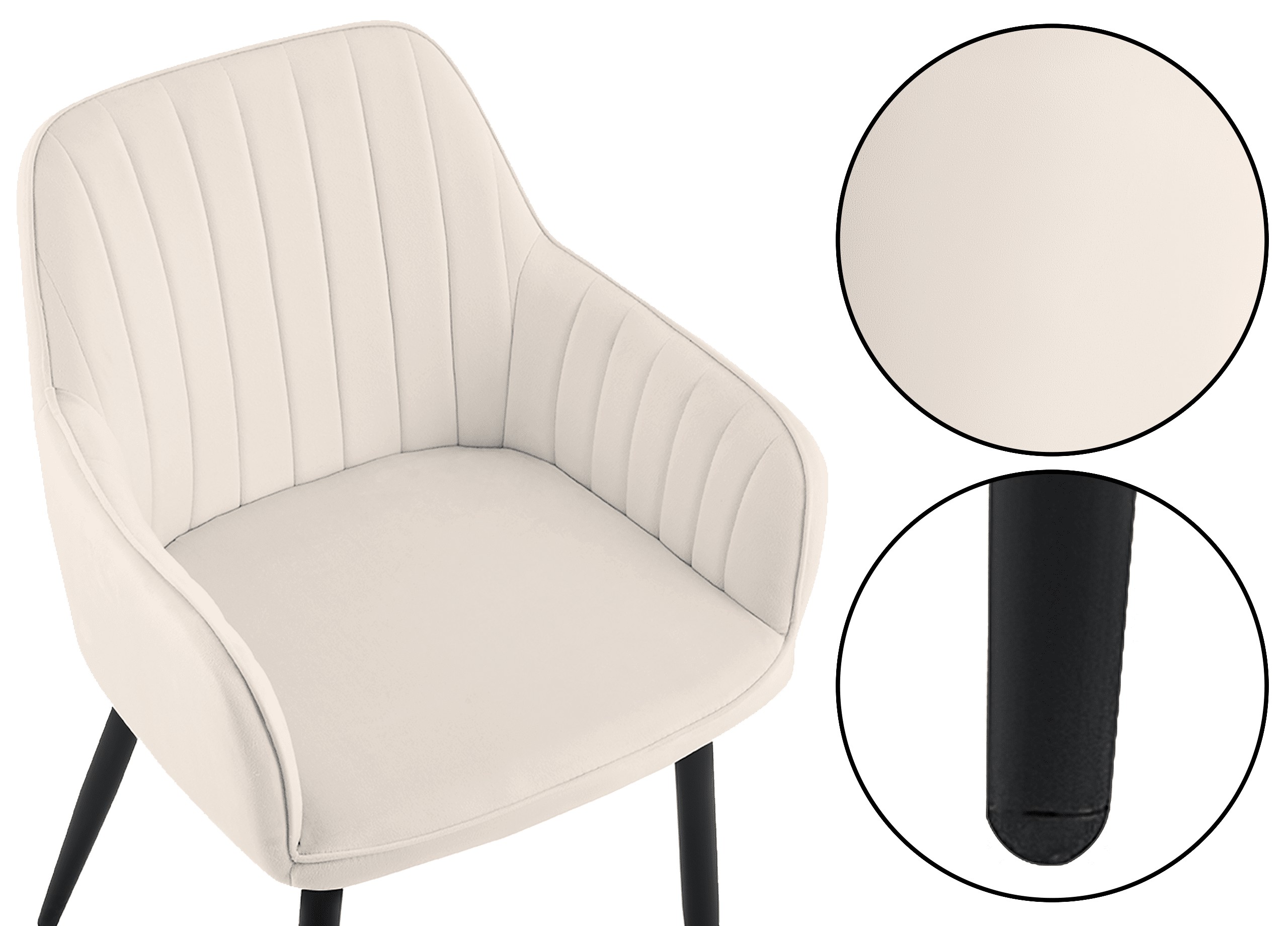 Стильне та сучасне крісло ковшоподібної форми, оббите оксамитовою тканиною. М'яке наповнення та профільована форма забезпечують комфорт використання, а витончені вертикальні прострочки додають елегантності будь-якому інтер'єру.