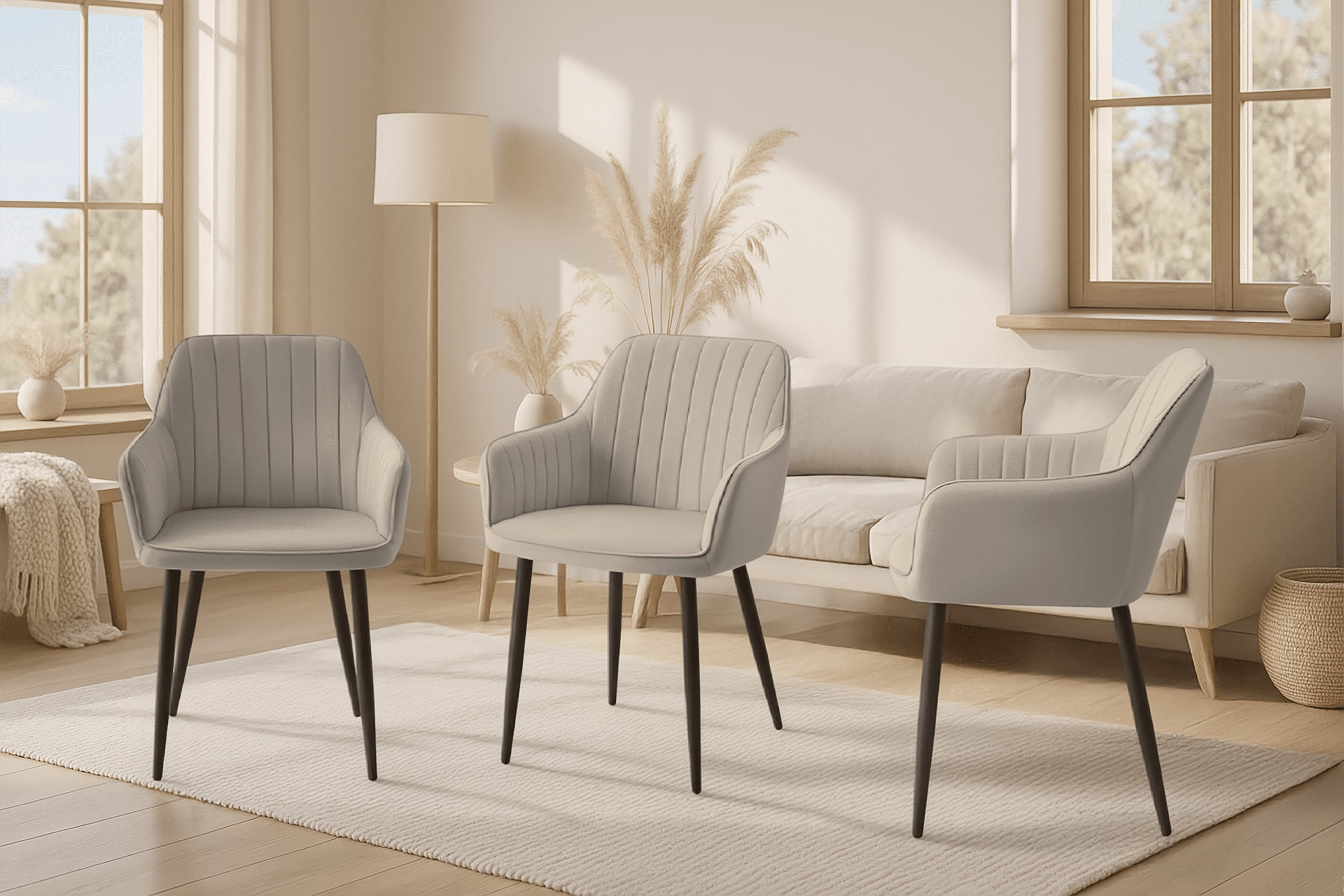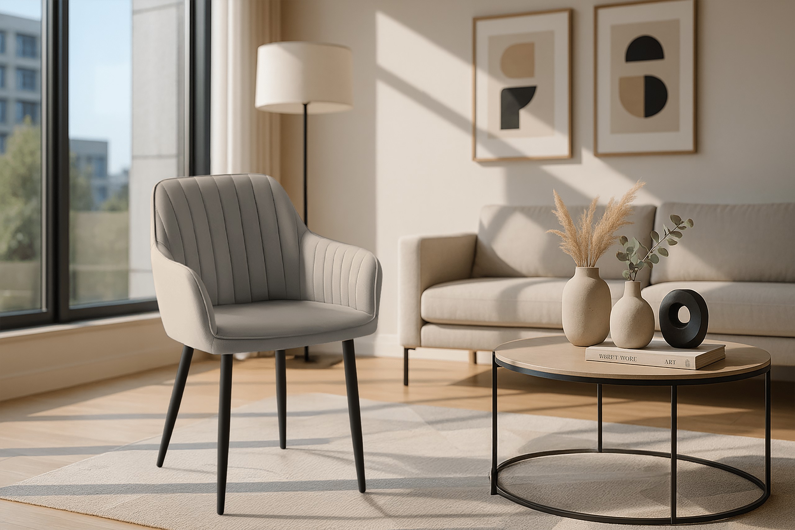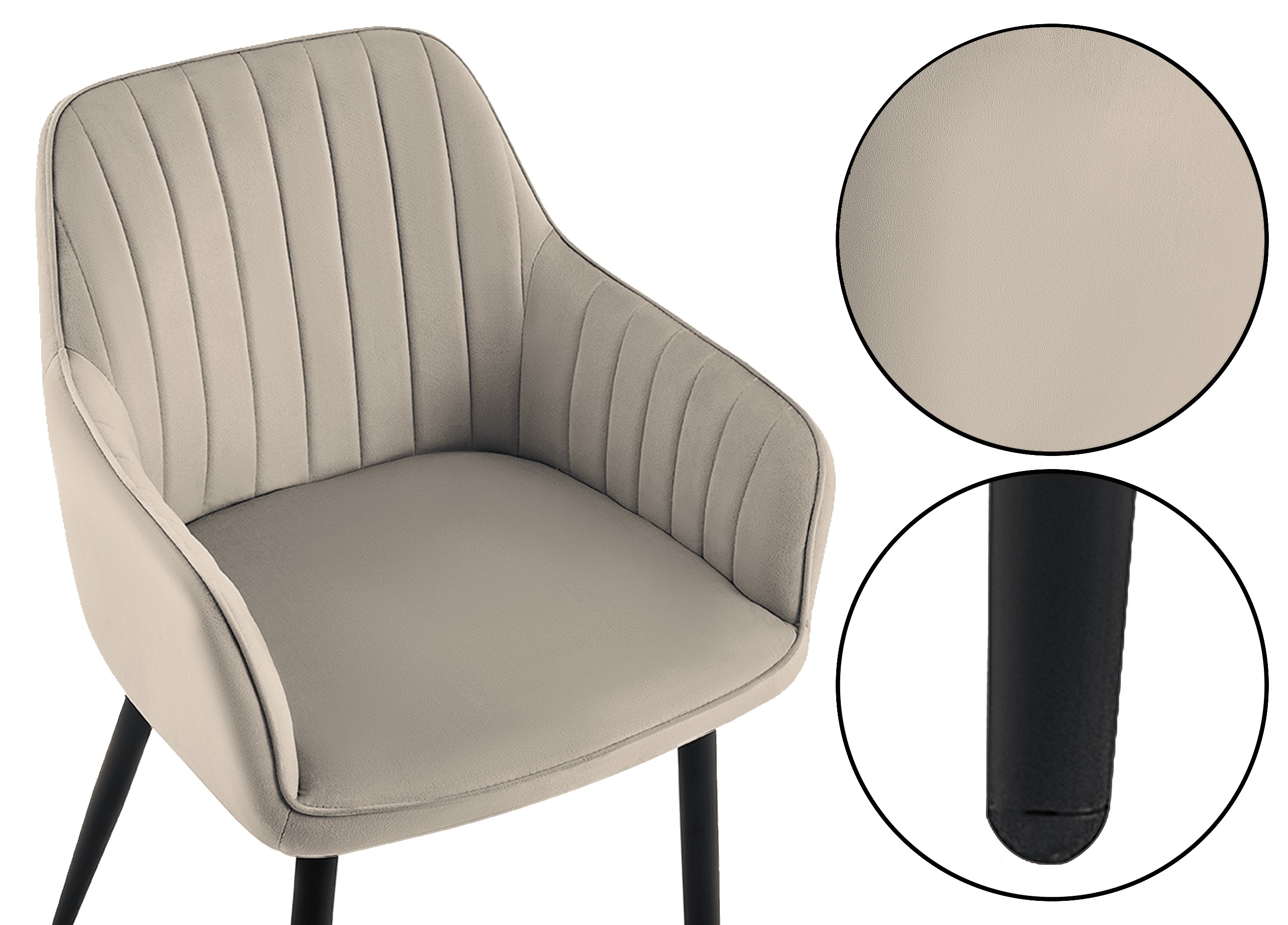 Сучасне та стильне крісло ергономічної форми, оббите м'якою вельветовою тканиною. Завдяки ковшоподібній формі та декоративним смужкам воно чудово підійде для вітальні, кухні або їдальні.
