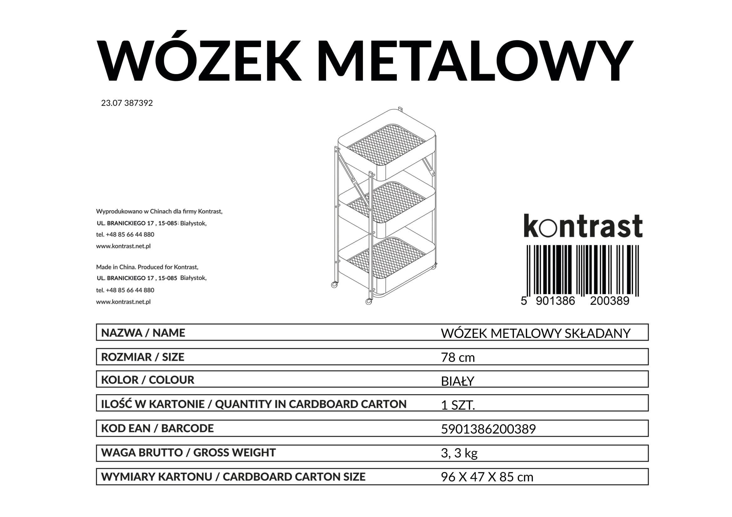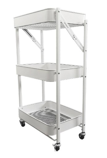 Складаний металевий візок 78 см, білийХАРАКТЕРИСТИКИ:Висота: 77 смШирина: 45 смГлибина: 29,5 смВідстань між полицями: 30,5 смРозміри коробки: 96x47x85 см