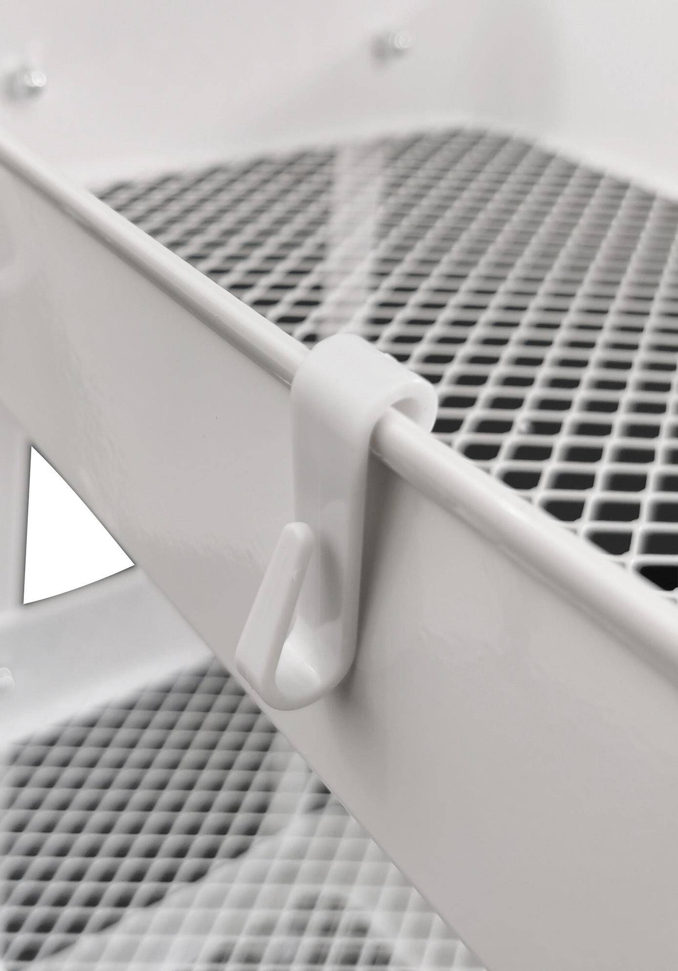 Три просторі полиці та чотири функціональні гачки забезпечують зручність та порядок. Металевий візок на коліщатках – це ідеальне рішення для зберігання найнеобхідніших аксесуарів під рукою.