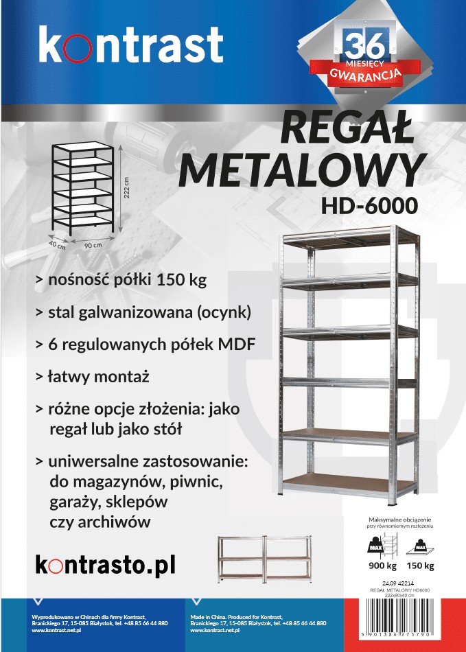 Стелаж Kontrast HD6000 вирізняється міцною конструкцією з оцинкованої сталі, що забезпечує його довговічність та стійкість до корозії. Полиці з МДФ товщиною 4 мм надзвичайно міцні, і кожна з них витримує навантаження до 150 кг, що дає загальну несучу здатність стелажа аж 900 кг! Завдяки системі затискання монтаж є інтуїтивно зрозумілим і не вимагає використання інструментів чи гвинтів, що значно скорочує час установки. У комплекті ви також знайдете 8 захисних накладок, які захищають поверхні від подряпин.