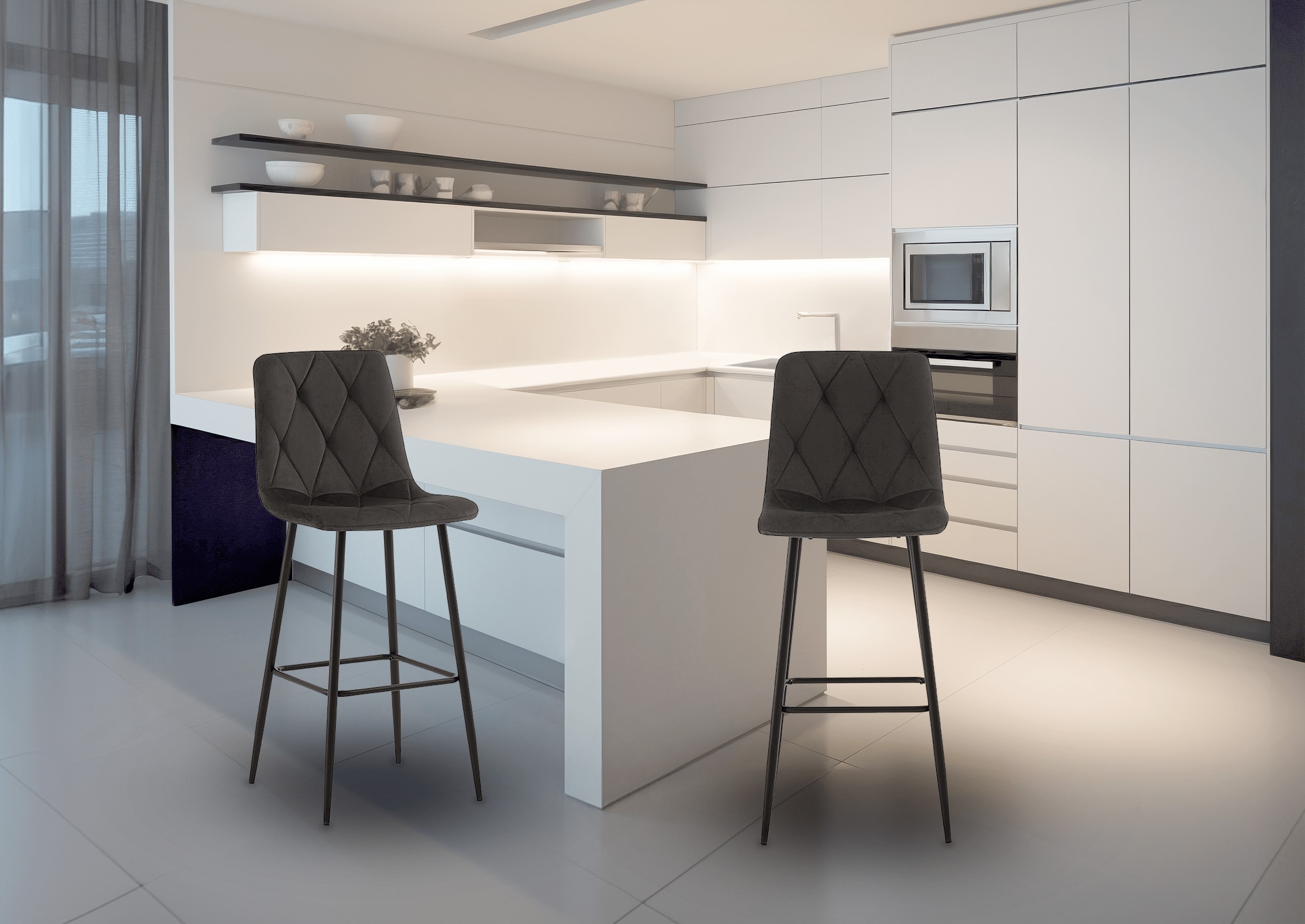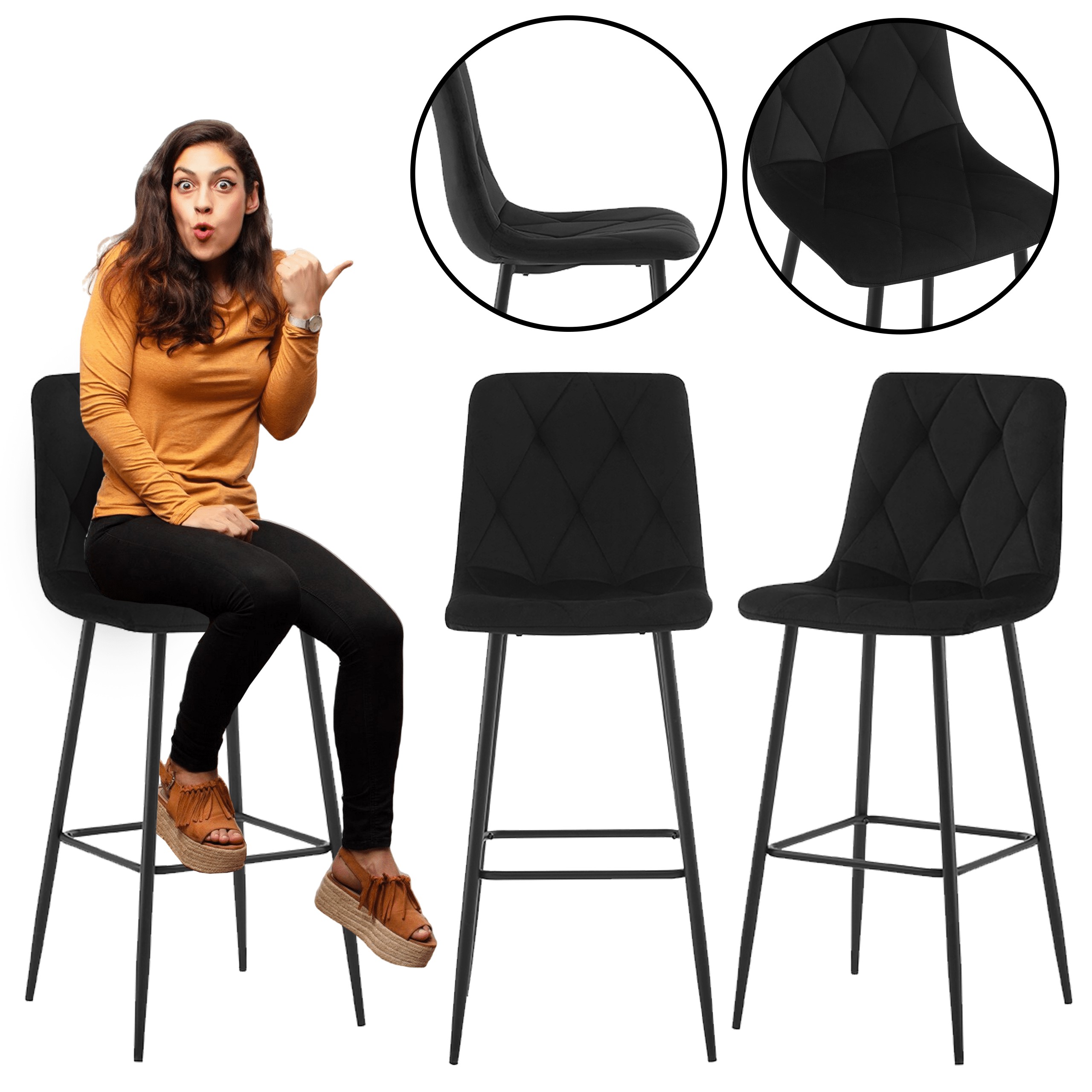 Сучасний та елегантний барний стілець H111 – ідеальний вибір для кухні, їдальні або барної зони. Чорна оббивка з оксамитової тканини та металевий каркас з порошковим покриттям створюють гармонійне поєднання стилю та функціональності. Він чудово підійде як для інтер'єрів у стилі лофт, так і для класичних.