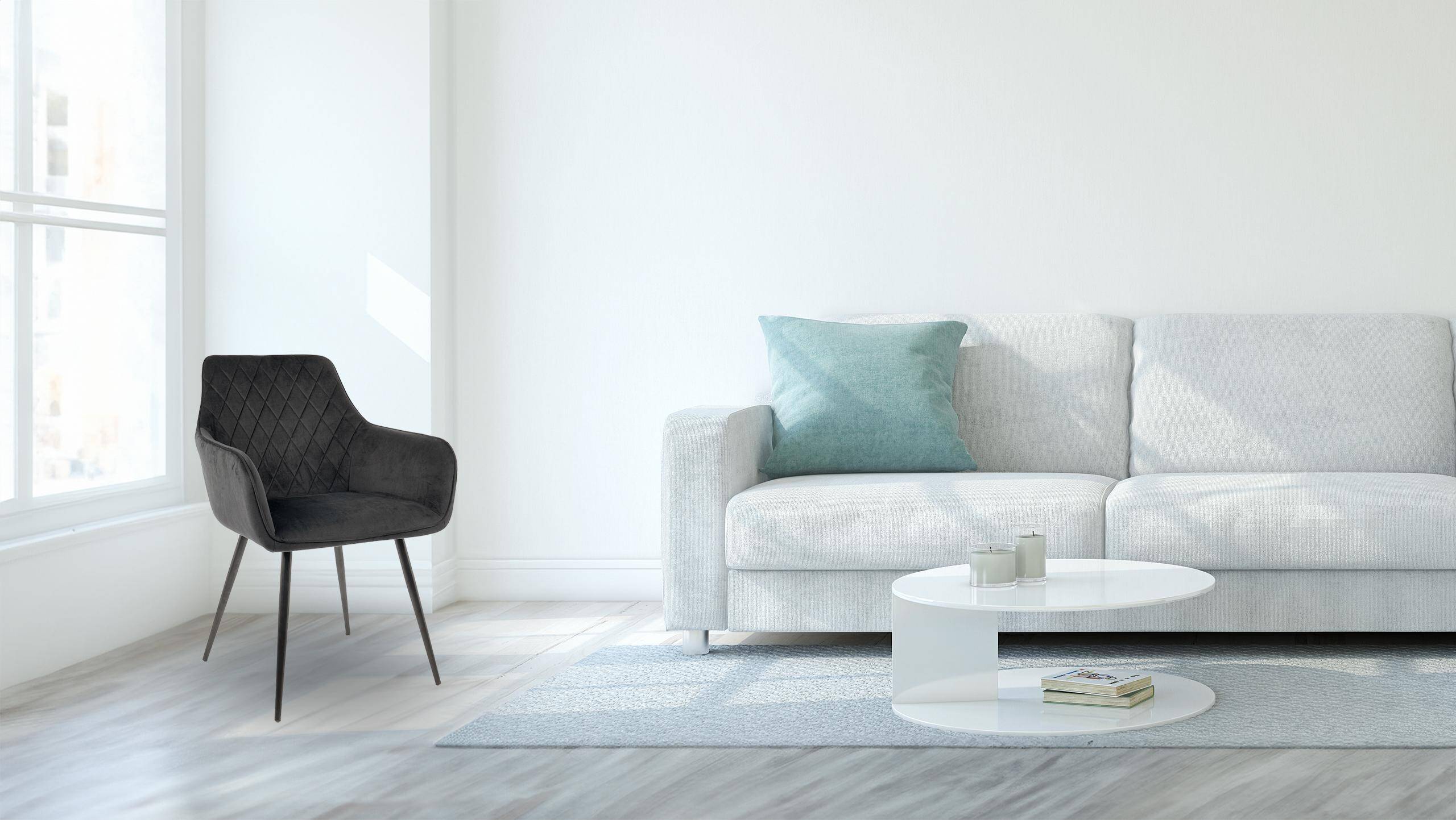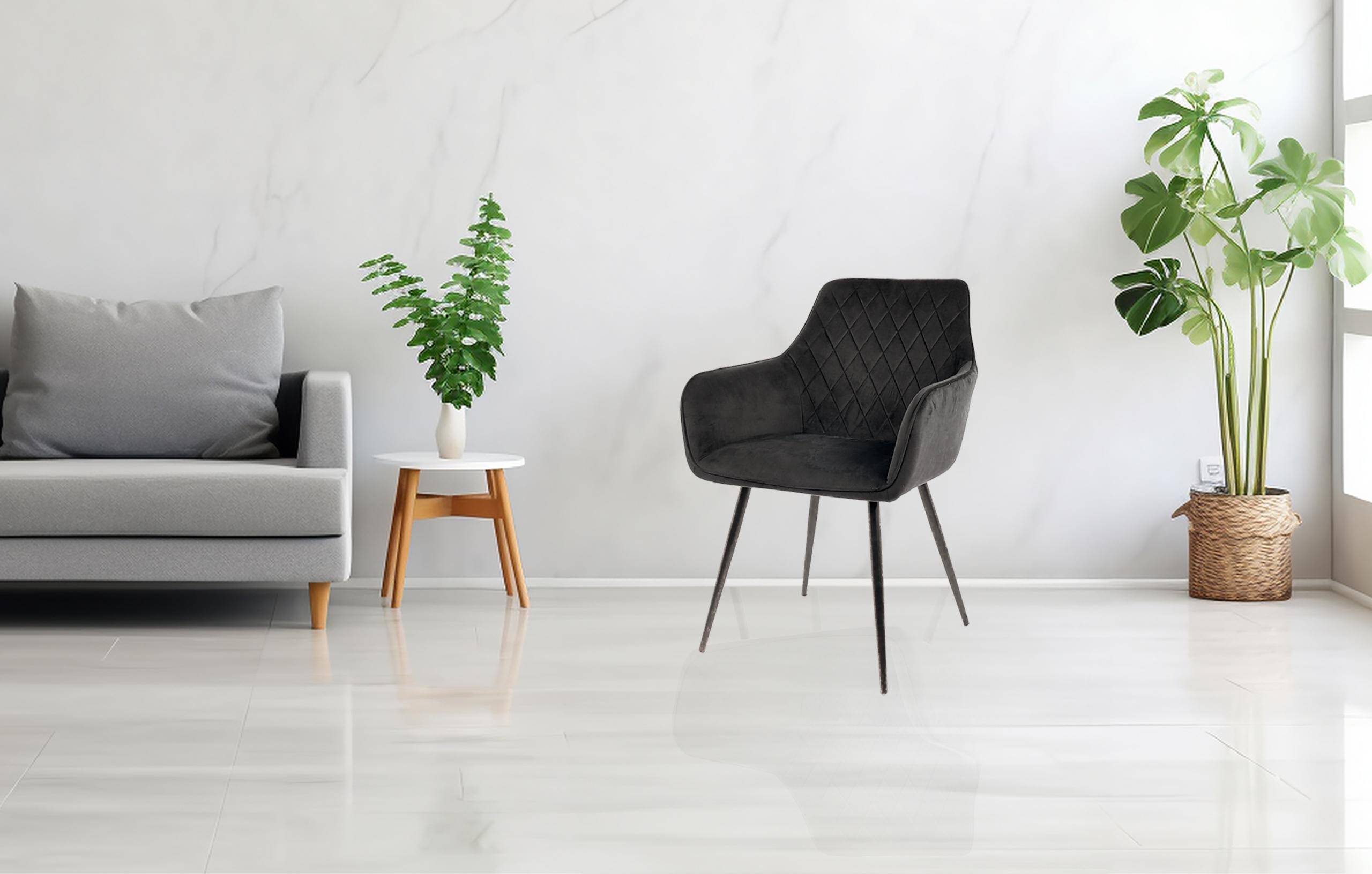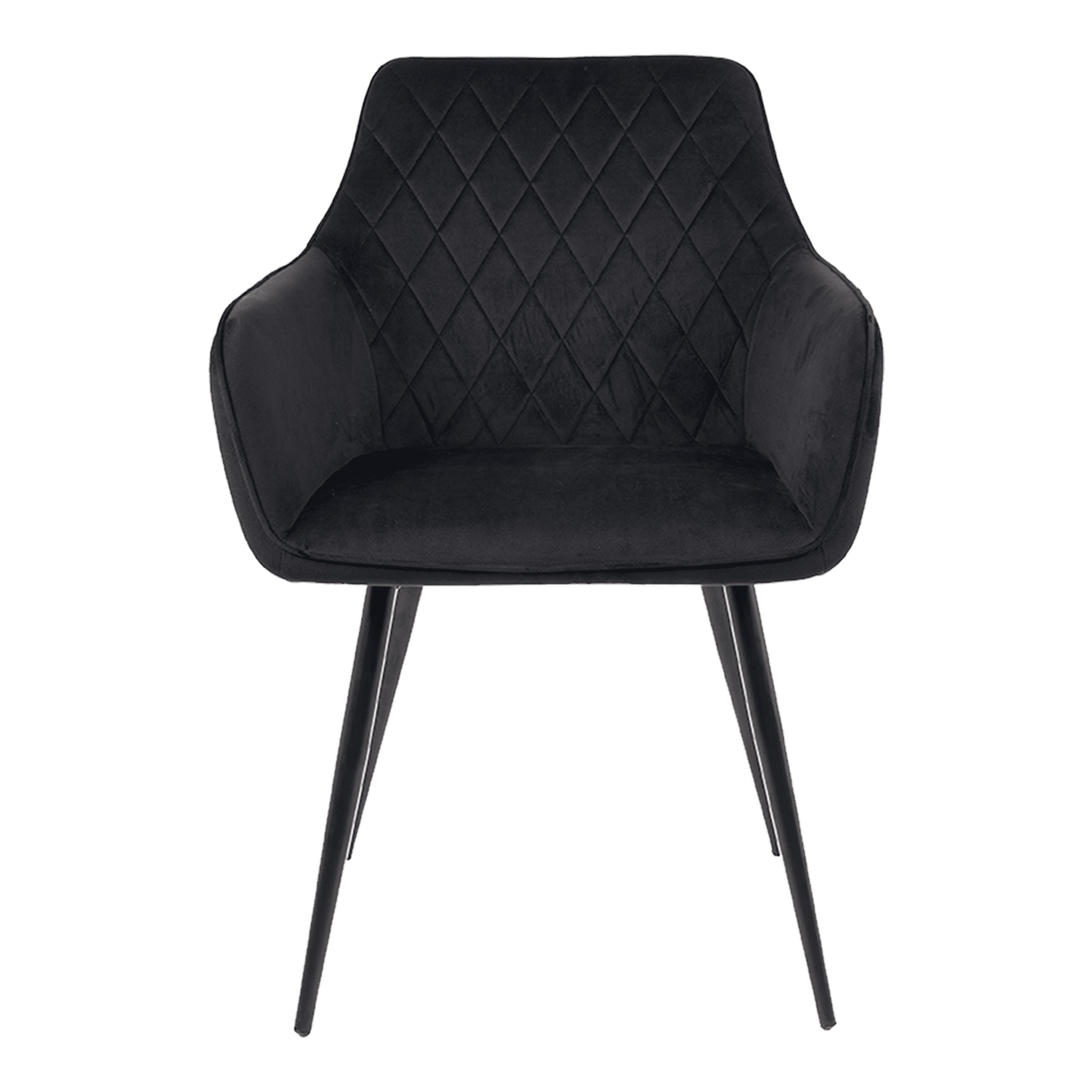 М'яка оббивка з велюрової тканини глибокого чорного відтінку чудово відбиває світло, а ромбоподібна стежка надає виробу особливого шарму. Наповнення з м'якої піни забезпечує комфорт, а металеві ніжки гарантують довговічність і стійкість.