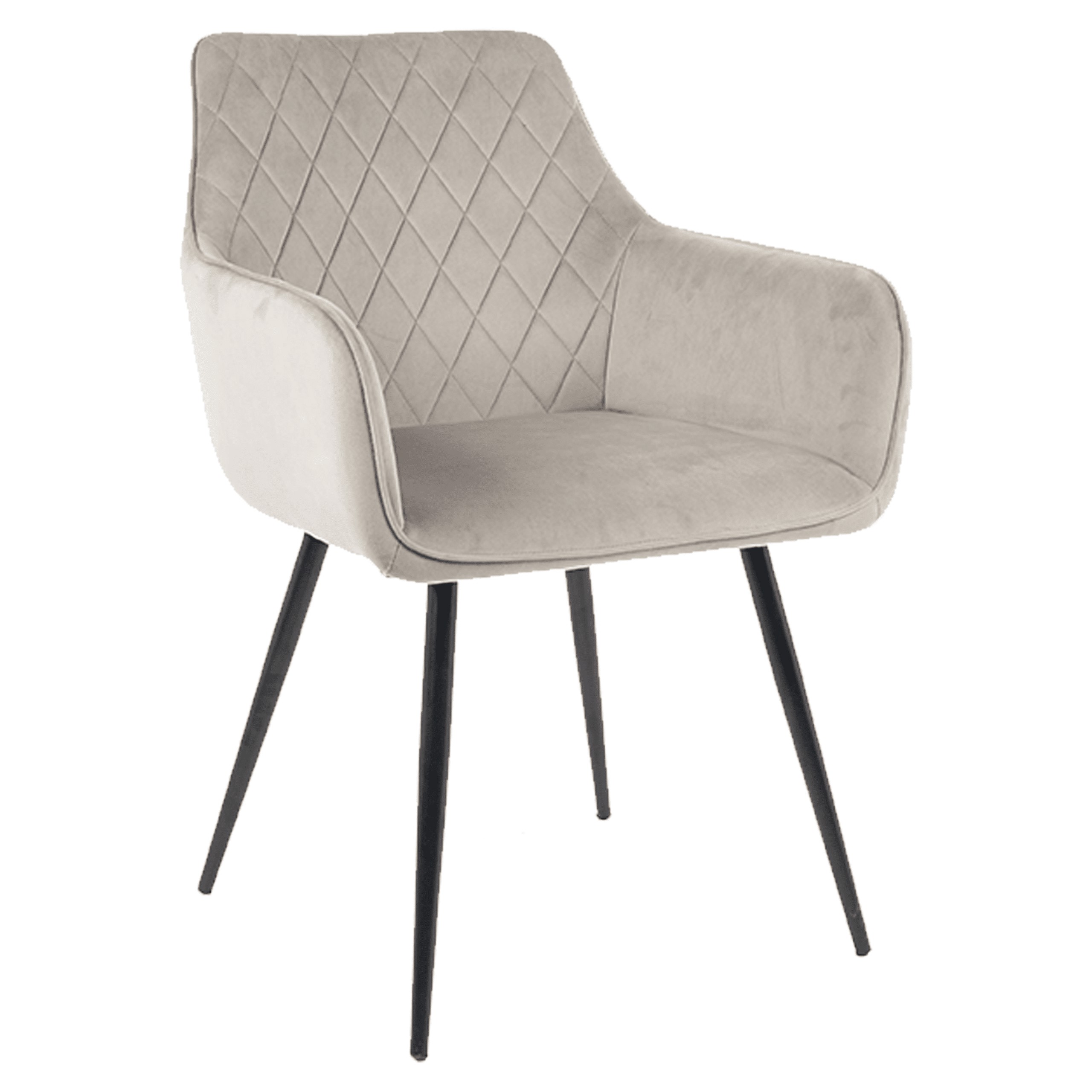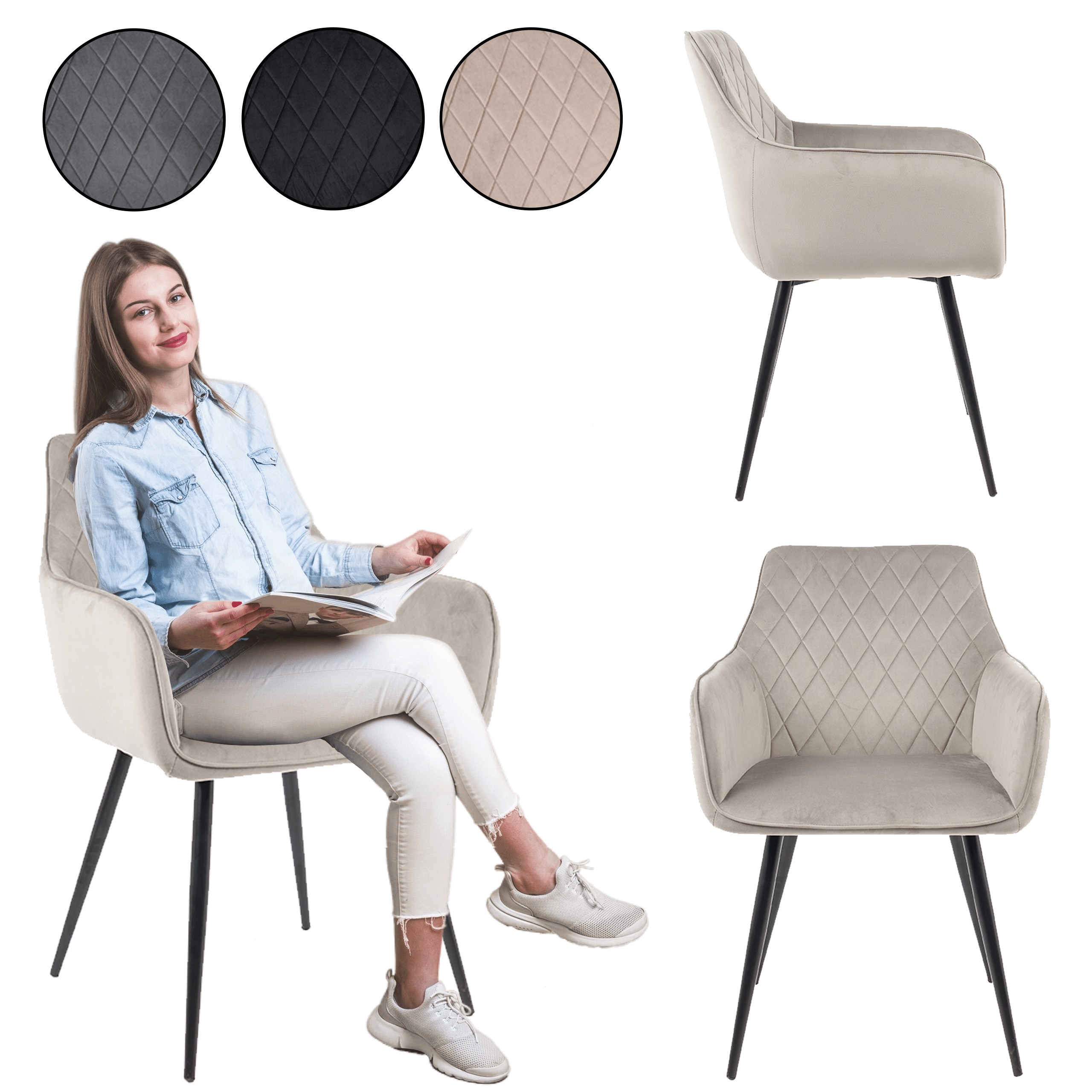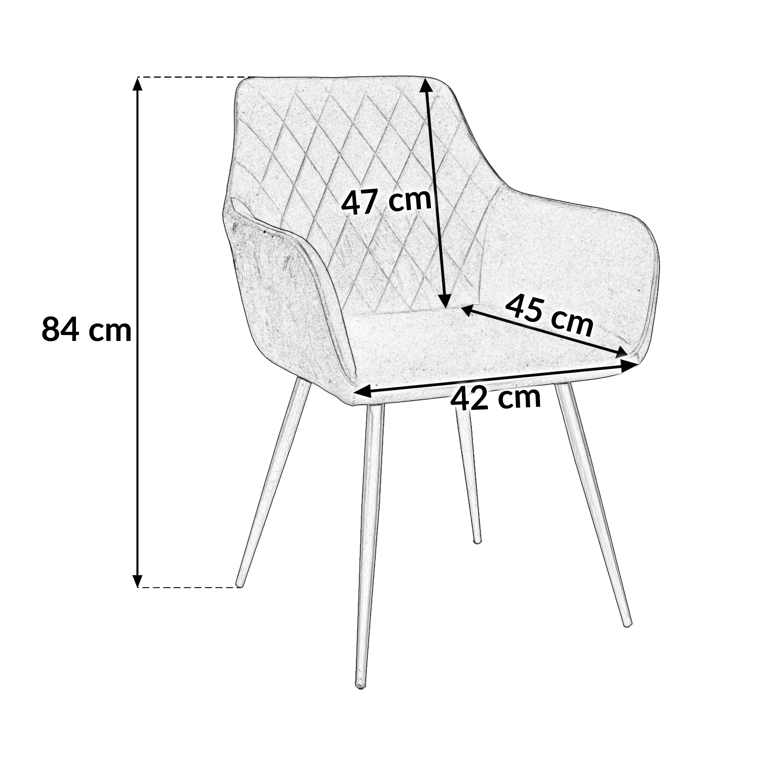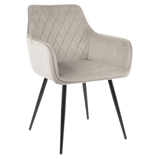 Оббивка з велюрової тканини та декоративна стежка у вигляді ромбів надають кріслу шику, а м'яка піна забезпечує винятковий комфорт сидіння. Стабільні металеві ніжки чорного кольору доповнюють загальний вигляд.