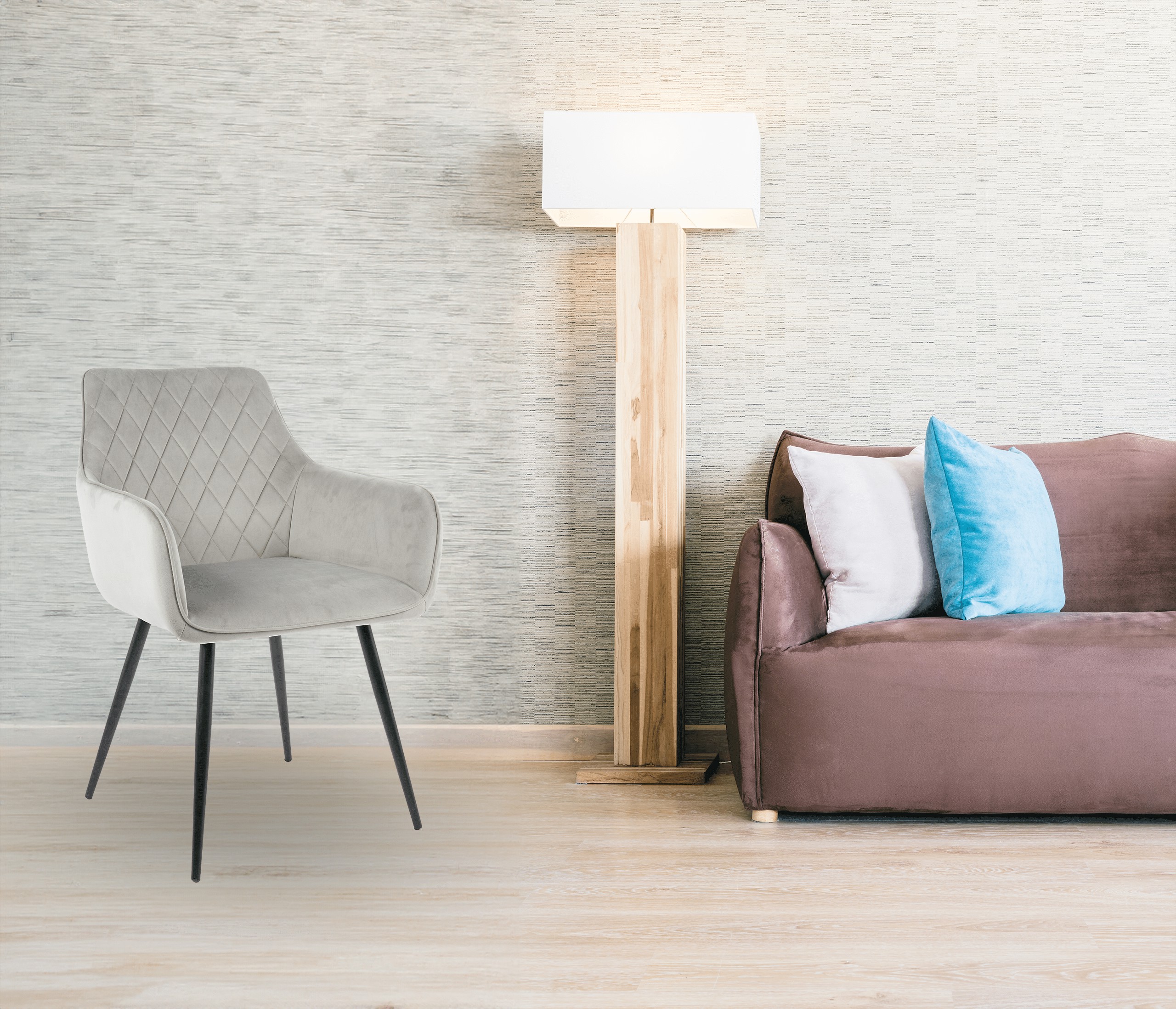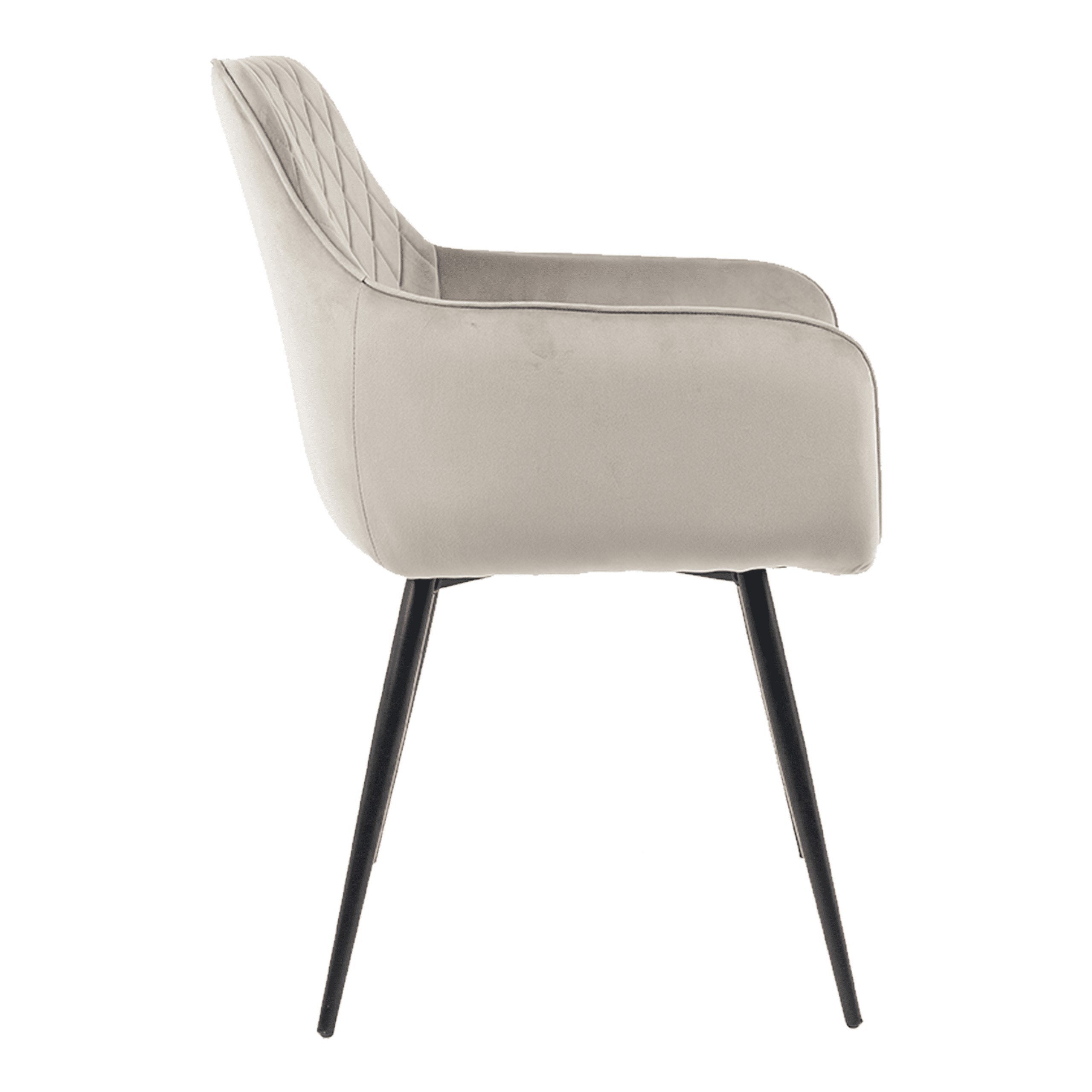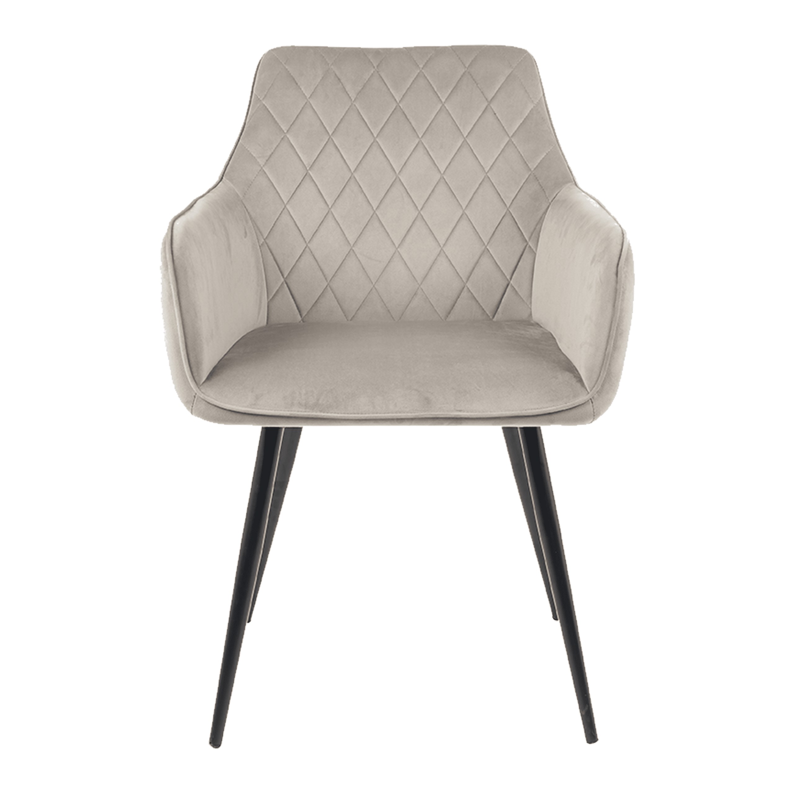 Оббивка з велюрової тканини та декоративна стежка у вигляді ромбів надають кріслу шику, а м'яка піна забезпечує винятковий комфорт сидіння. Стабільні металеві ніжки чорного кольору доповнюють загальний вигляд.
