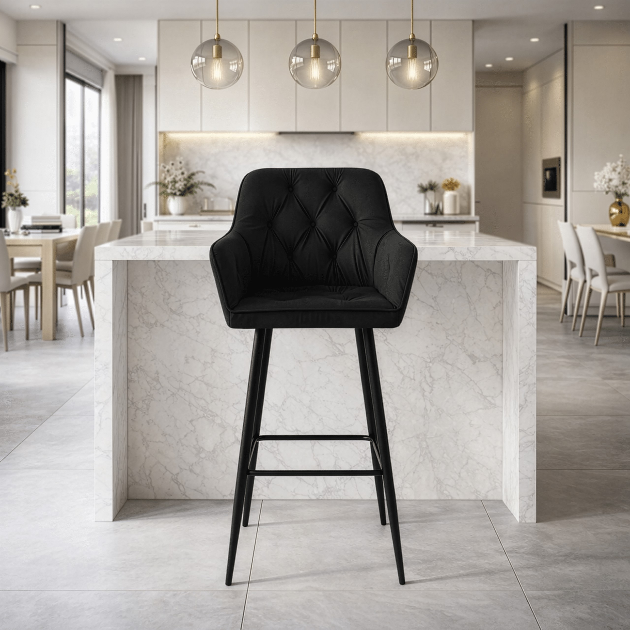 Елегантне барне крісло, розроблене спеціально для сучасних інтер'єрів. М'яке сидіння з оксамитової тканини забезпечує комфорт, а металева конструкція підкреслює індустріальний характер меблів.